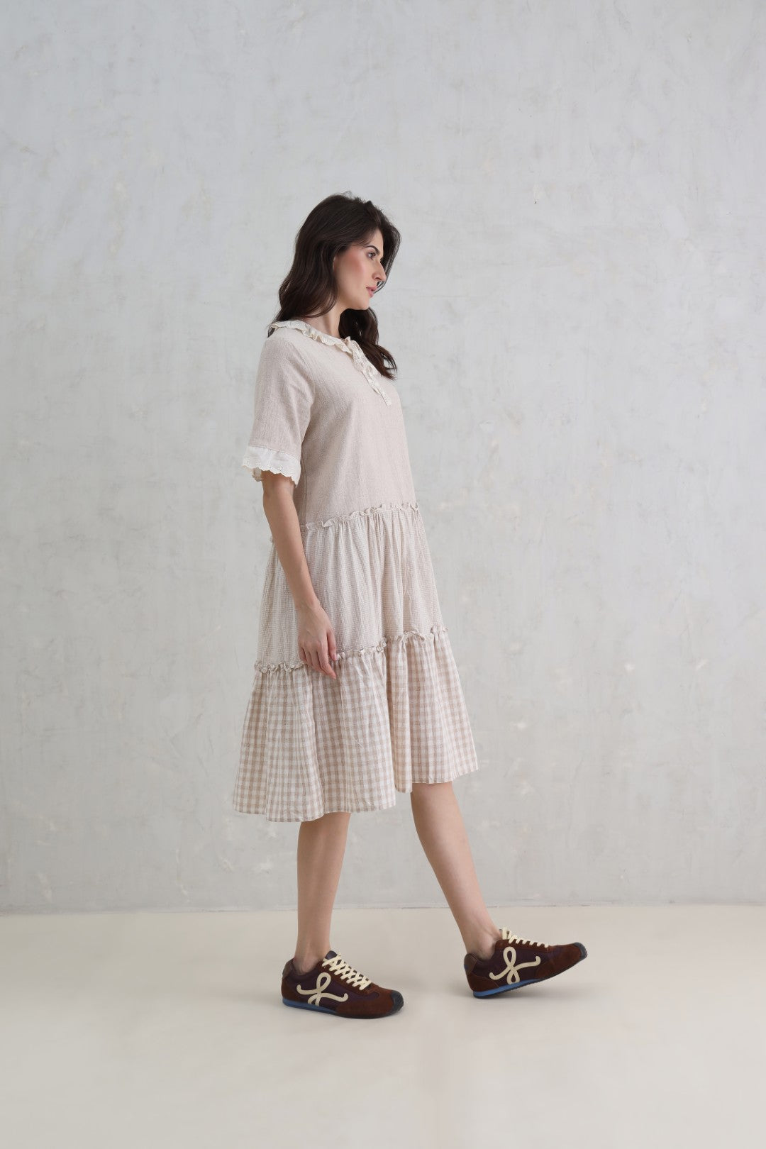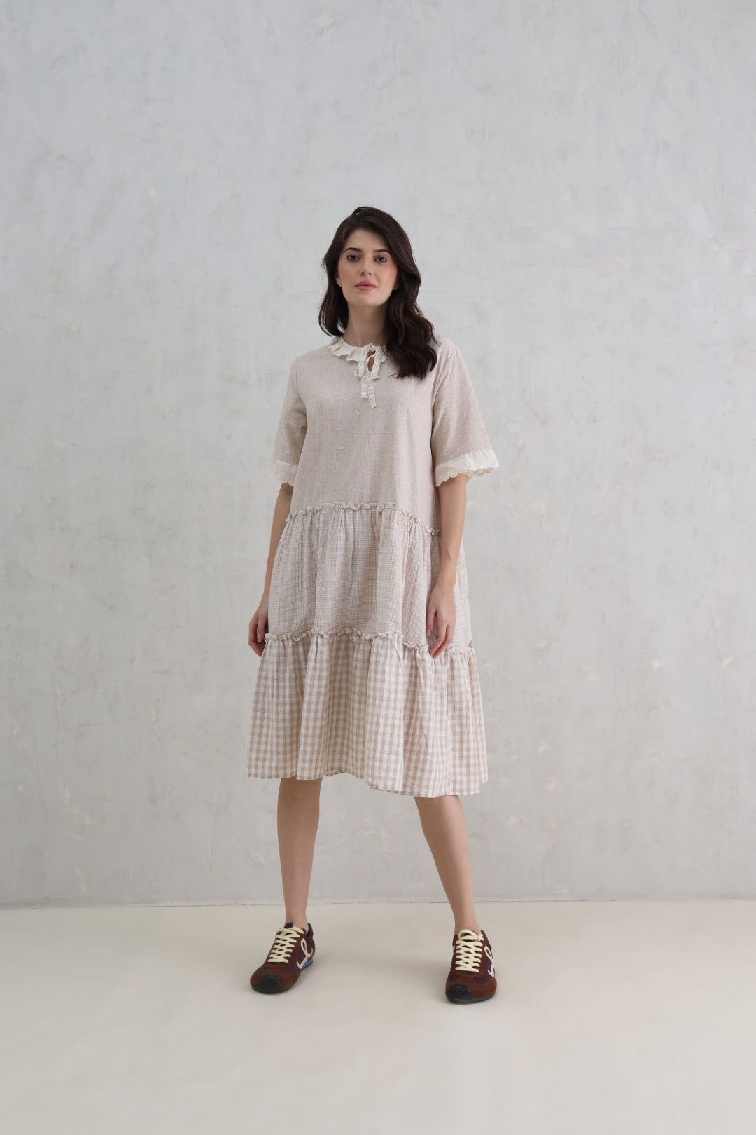 This soft gingham check dress features playful tiers, gentle ruffles, and delicate lace trims that come together to create a charming vintage-inspired look. Light and feminine, it’s perfect for warm days when you want to feel effortlessly pretty. A timeless piece that blends comfort with subtle romantic detail.