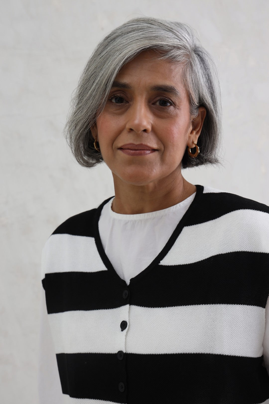 This waistcoat features a playful mix of classic black and white stripes in a textured flat knit structure, adding depth and character to any outfit. Perfect for layering, it brings a fun, modern twist to timeless styling—an easy way to elevate your look with bold, graphic charm.