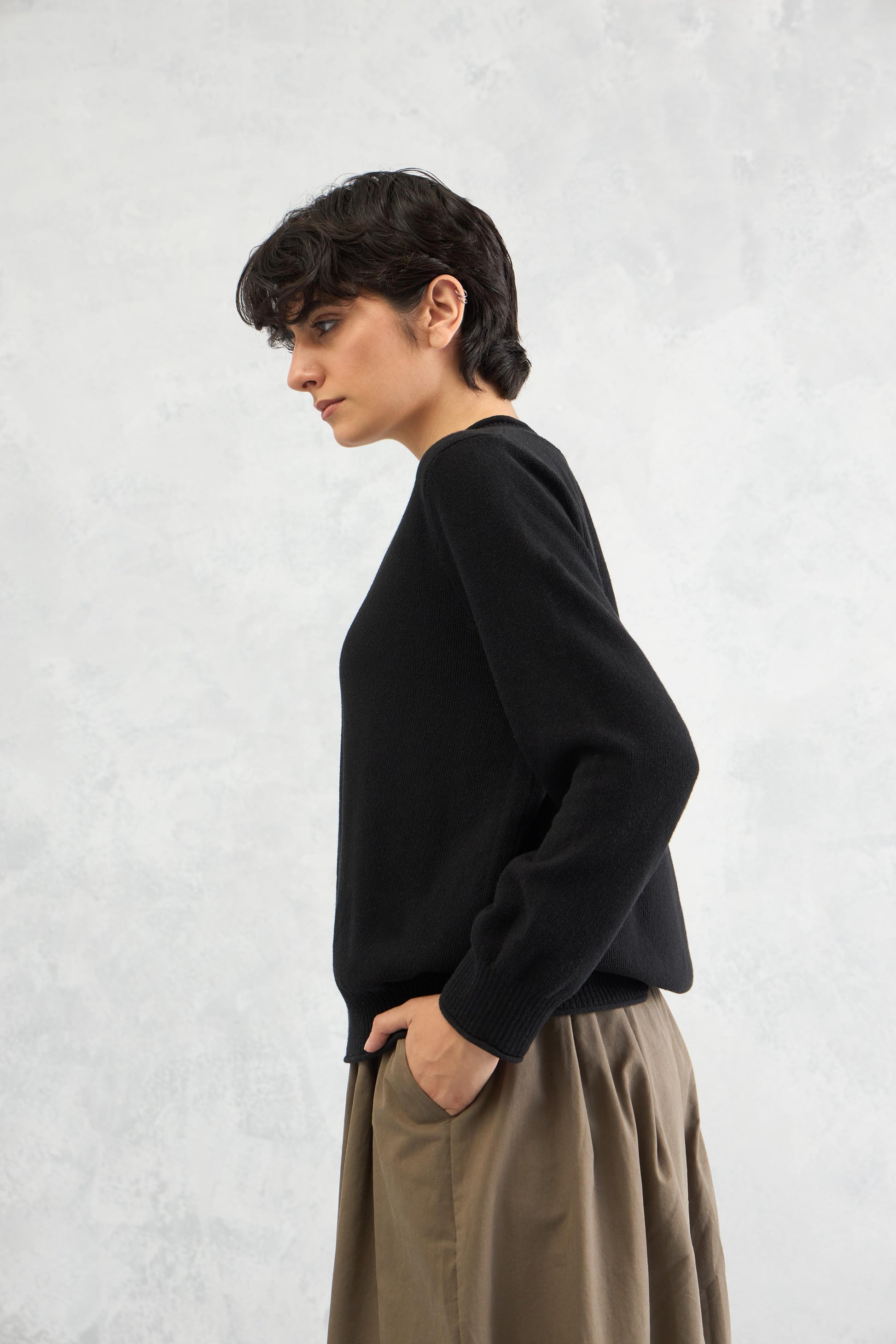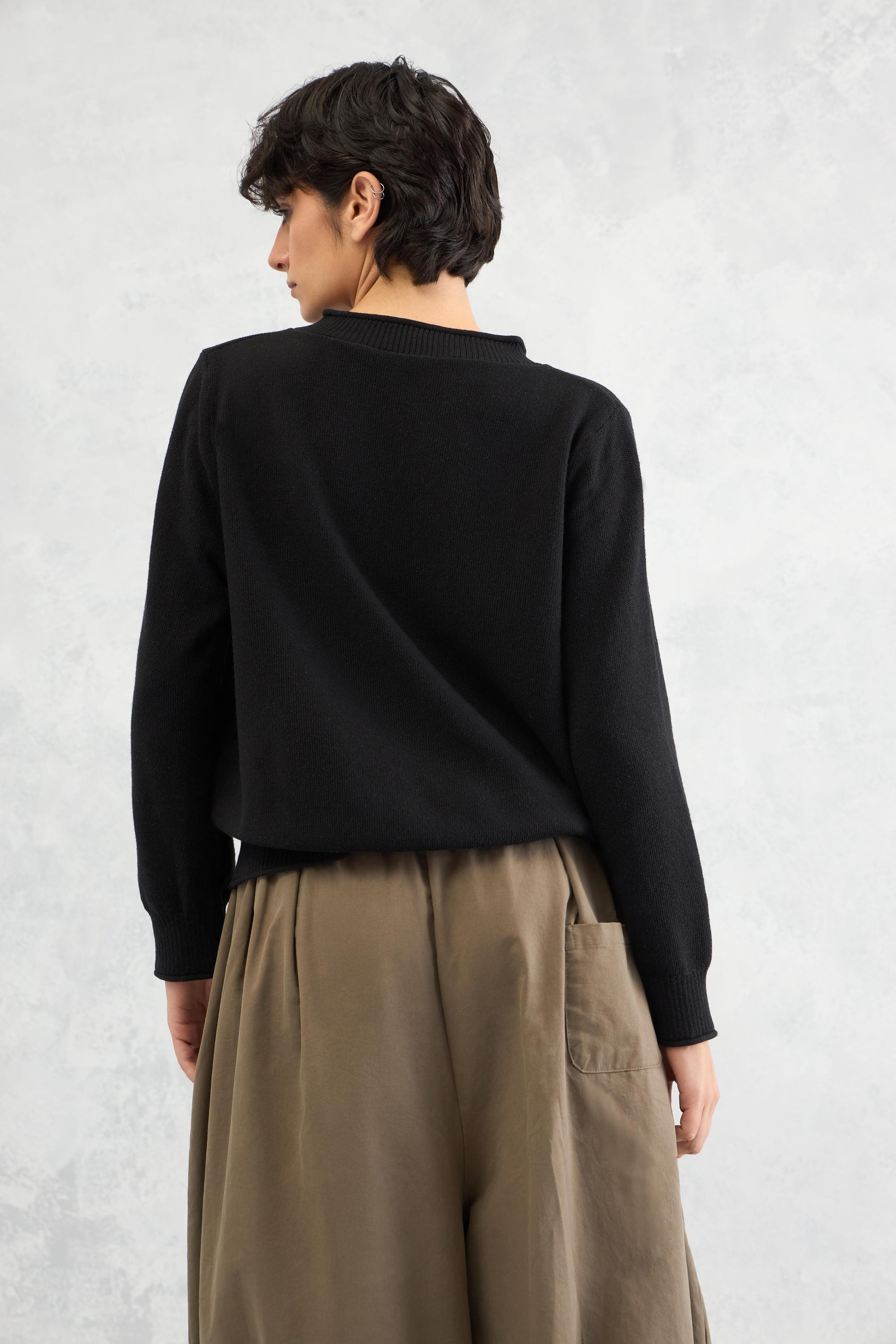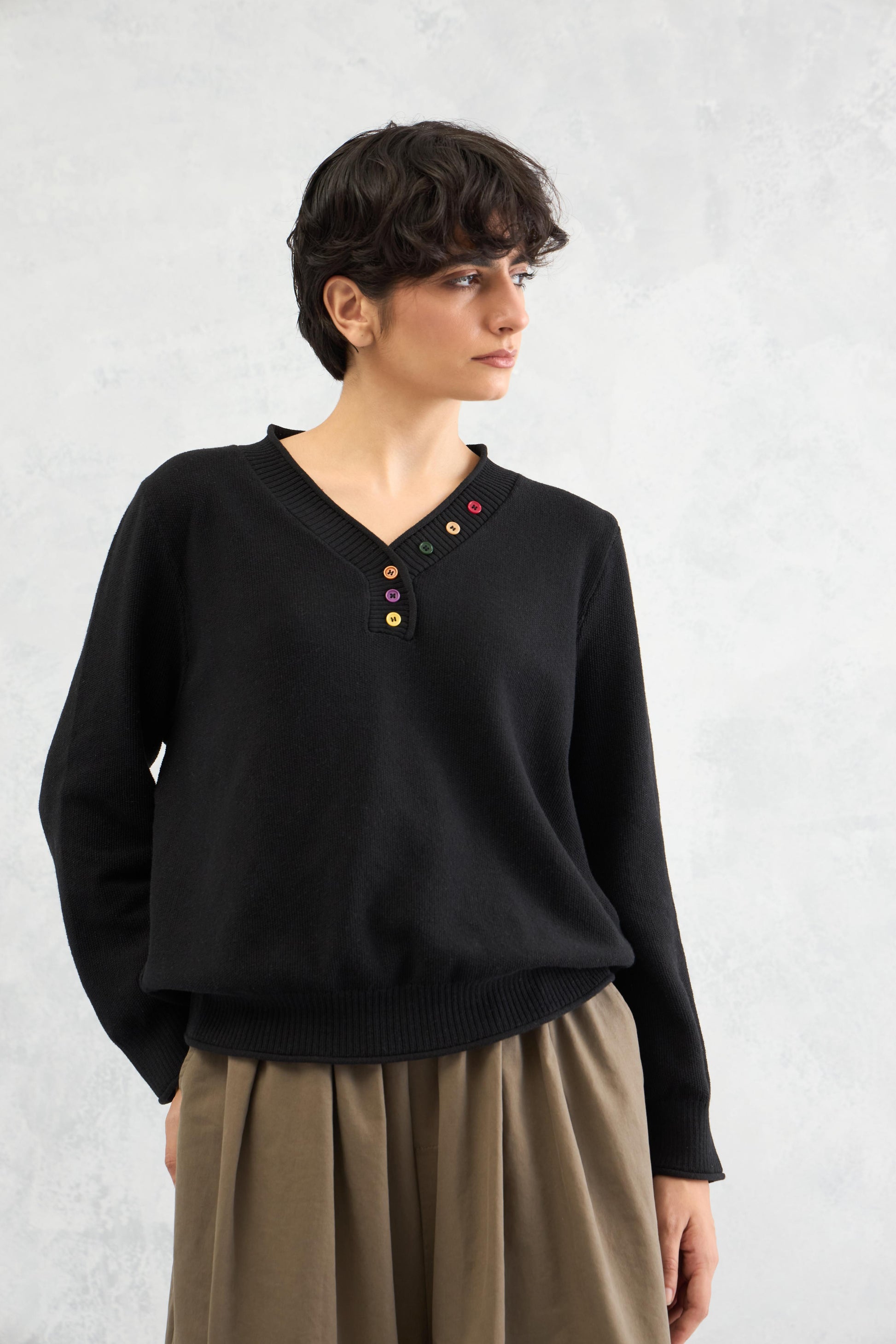 A classic flat knit cotton jumper elevated with an interesting neckline and colorful button detailing, adding a playful highlight to a timeless silhouette.