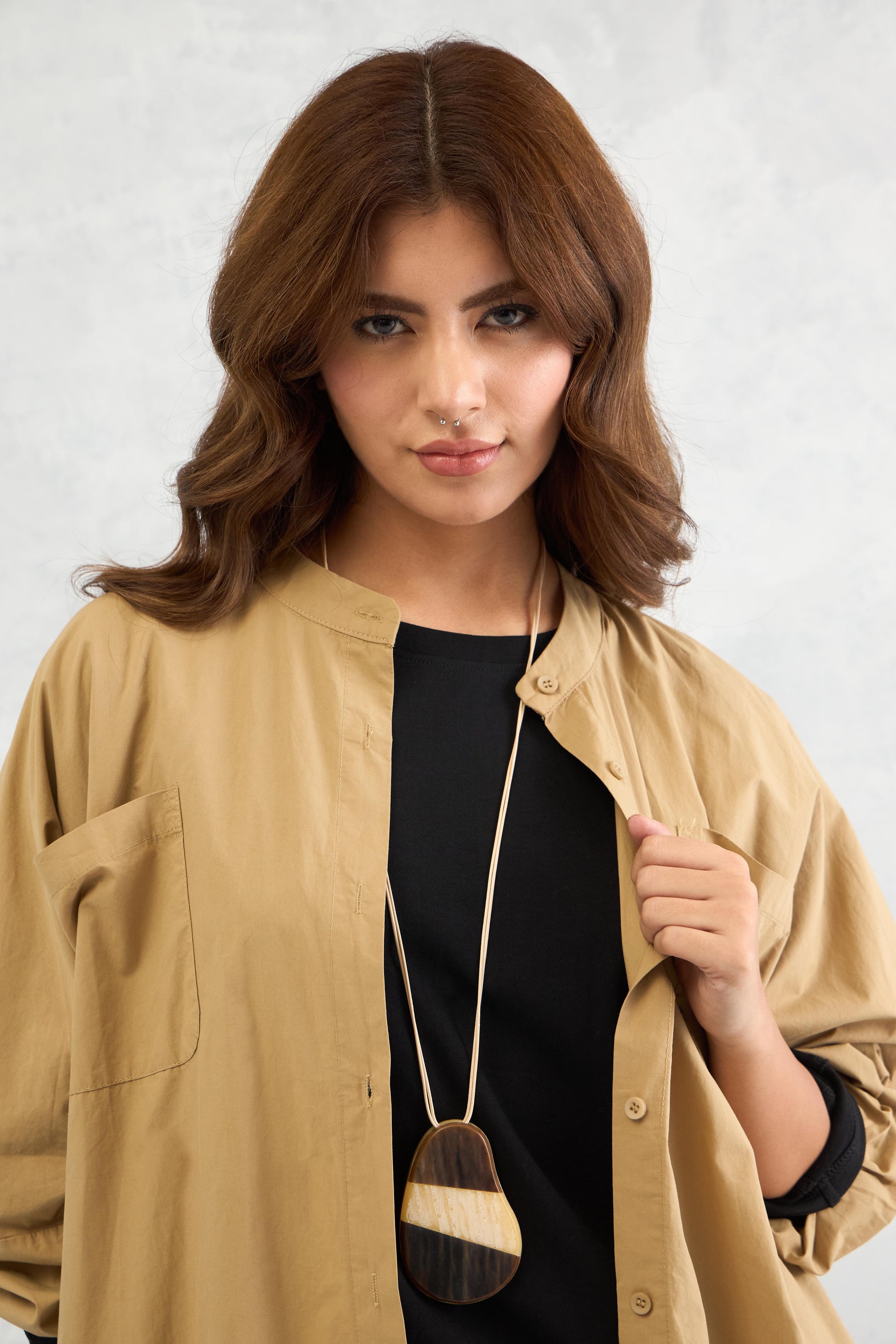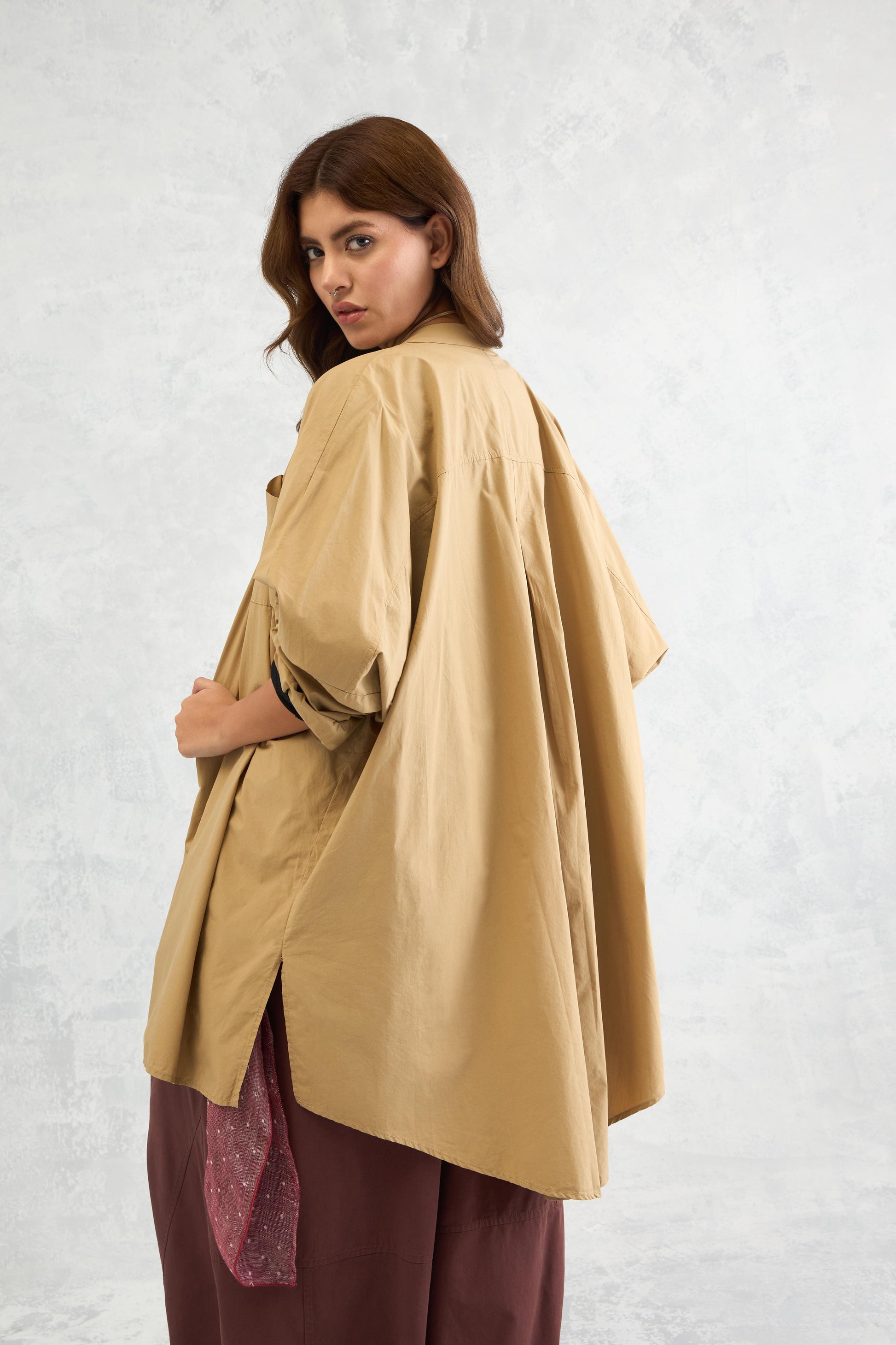 An oversized long shirt with drop shoulders, a band collar, and double pockets, finished with a curved hem for a sharp, edgy silhouette.