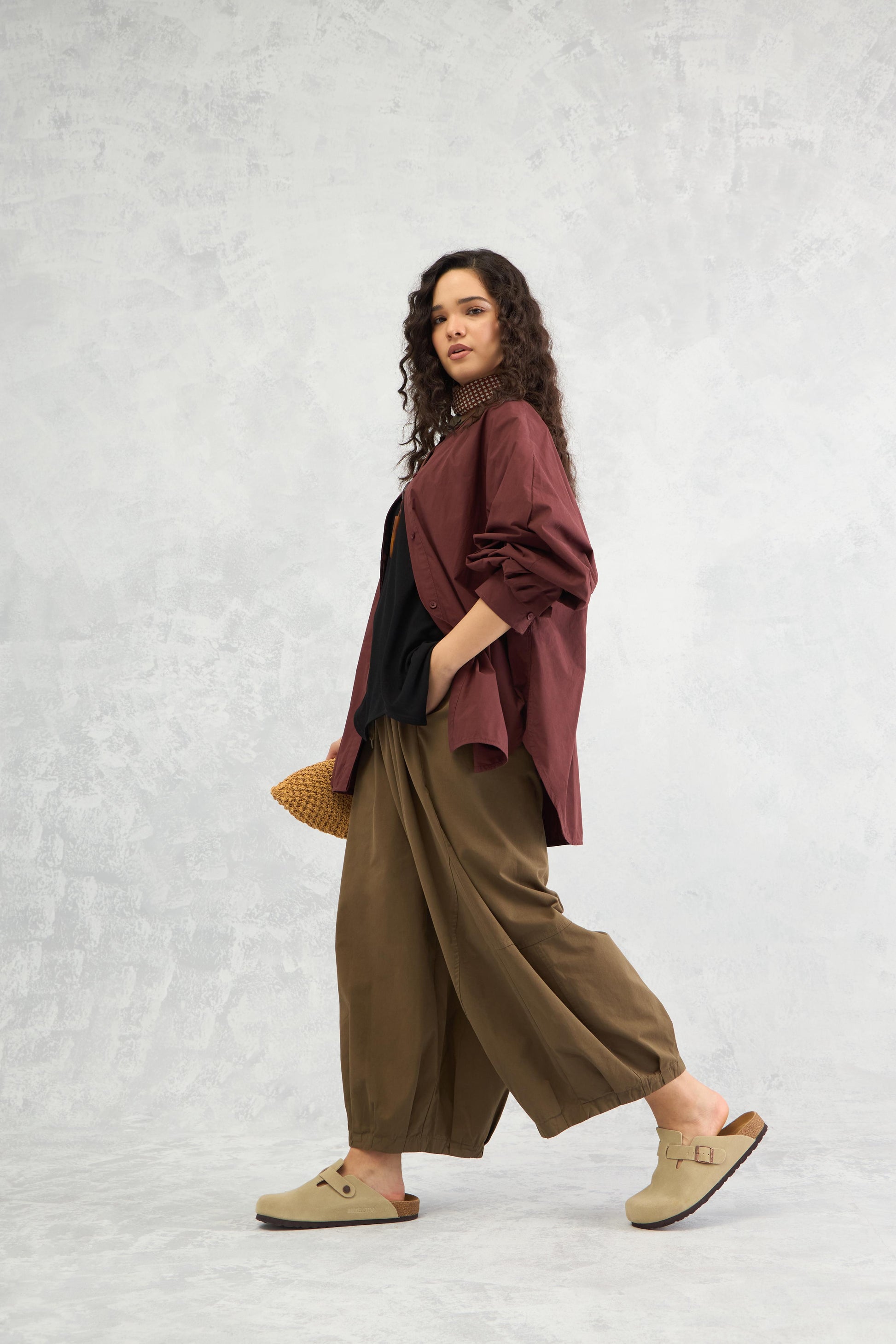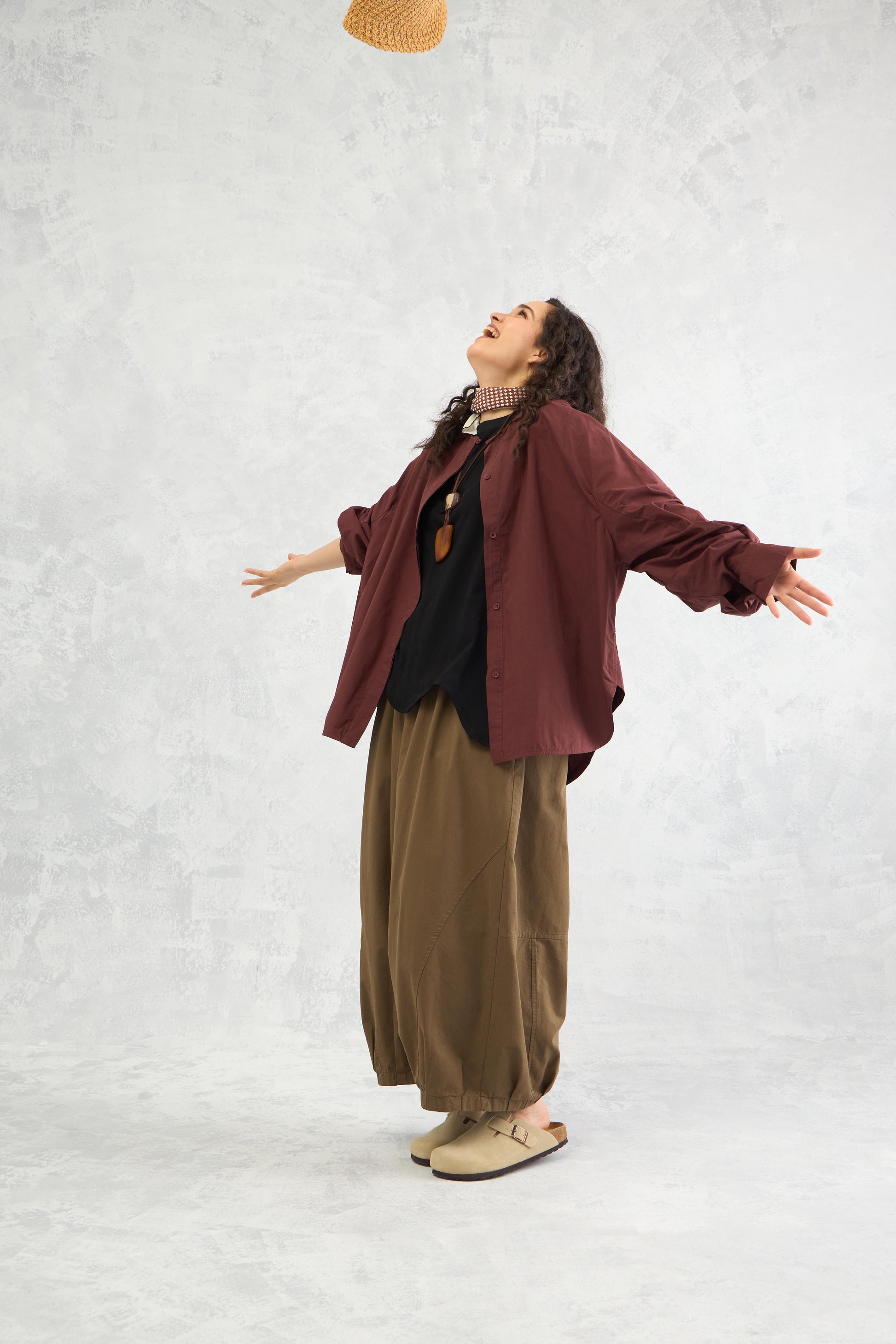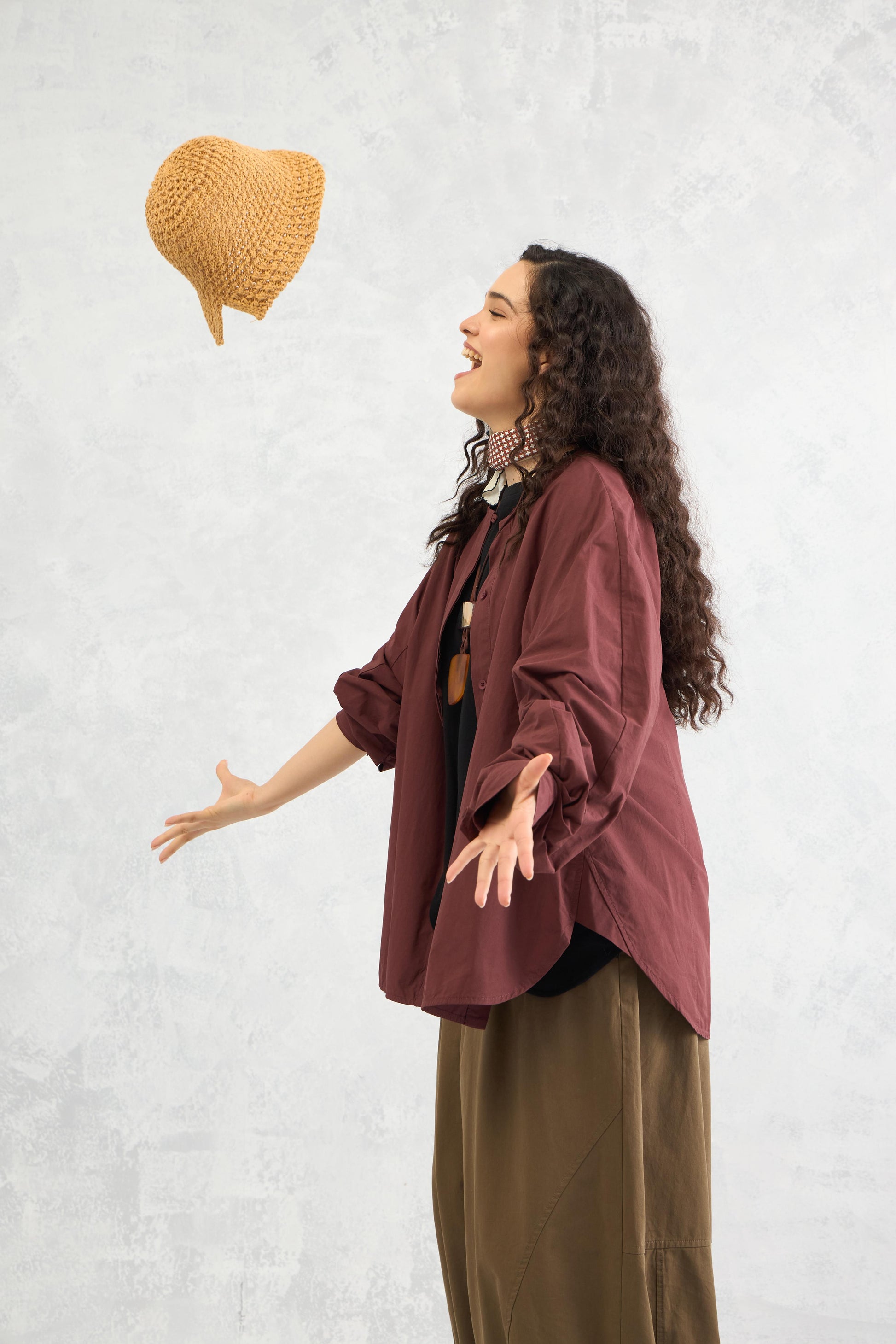 A relaxed shirt with a crew neckline, concealed placket, and drop shoulders. Finished with pleated sleeves and a curved hem for volume, comfort, and modern edge.