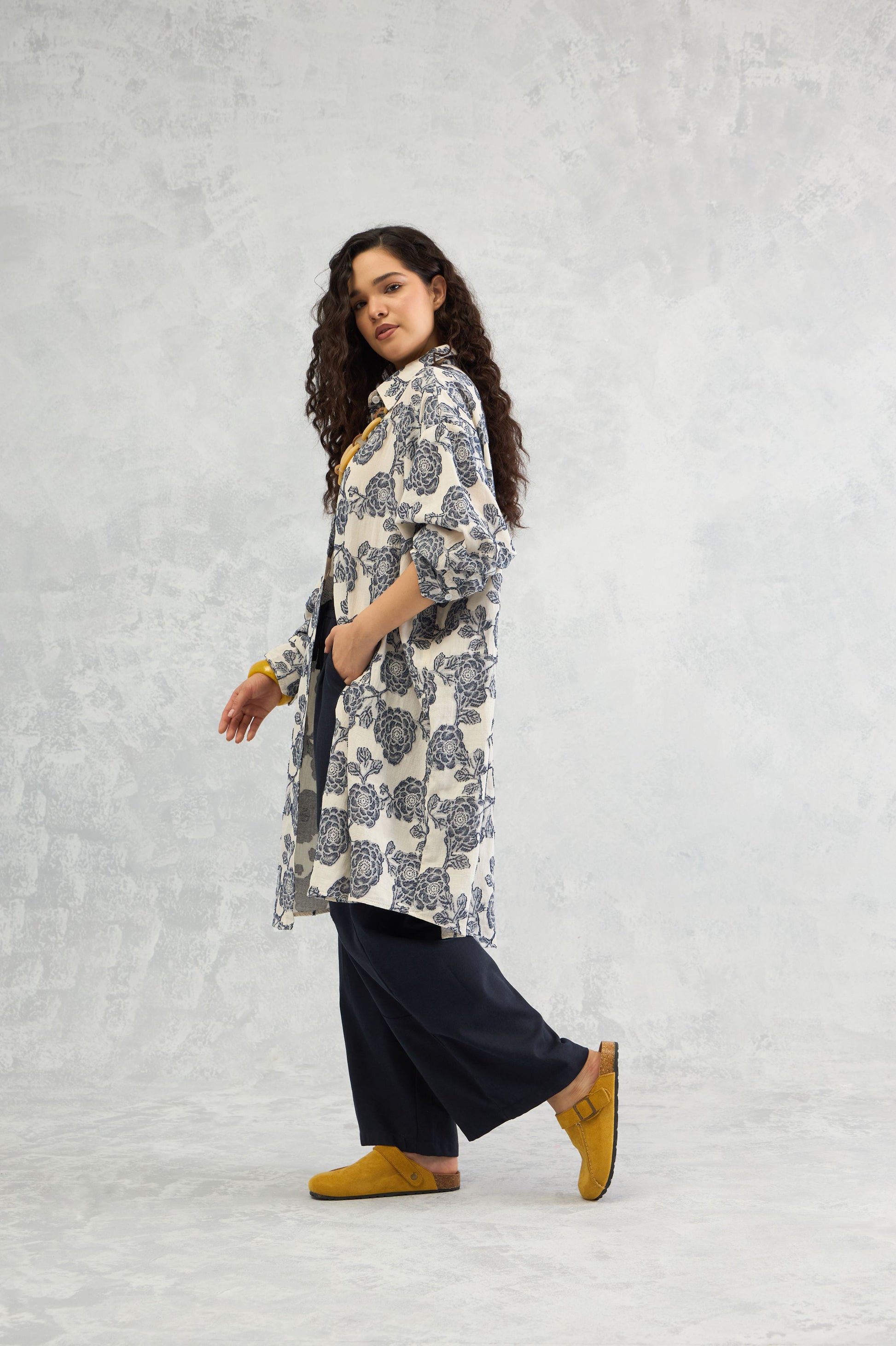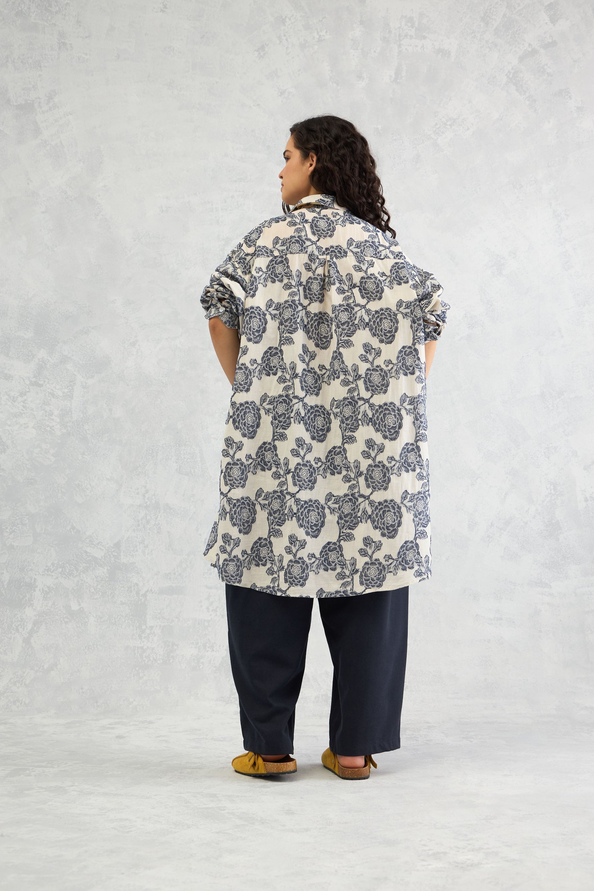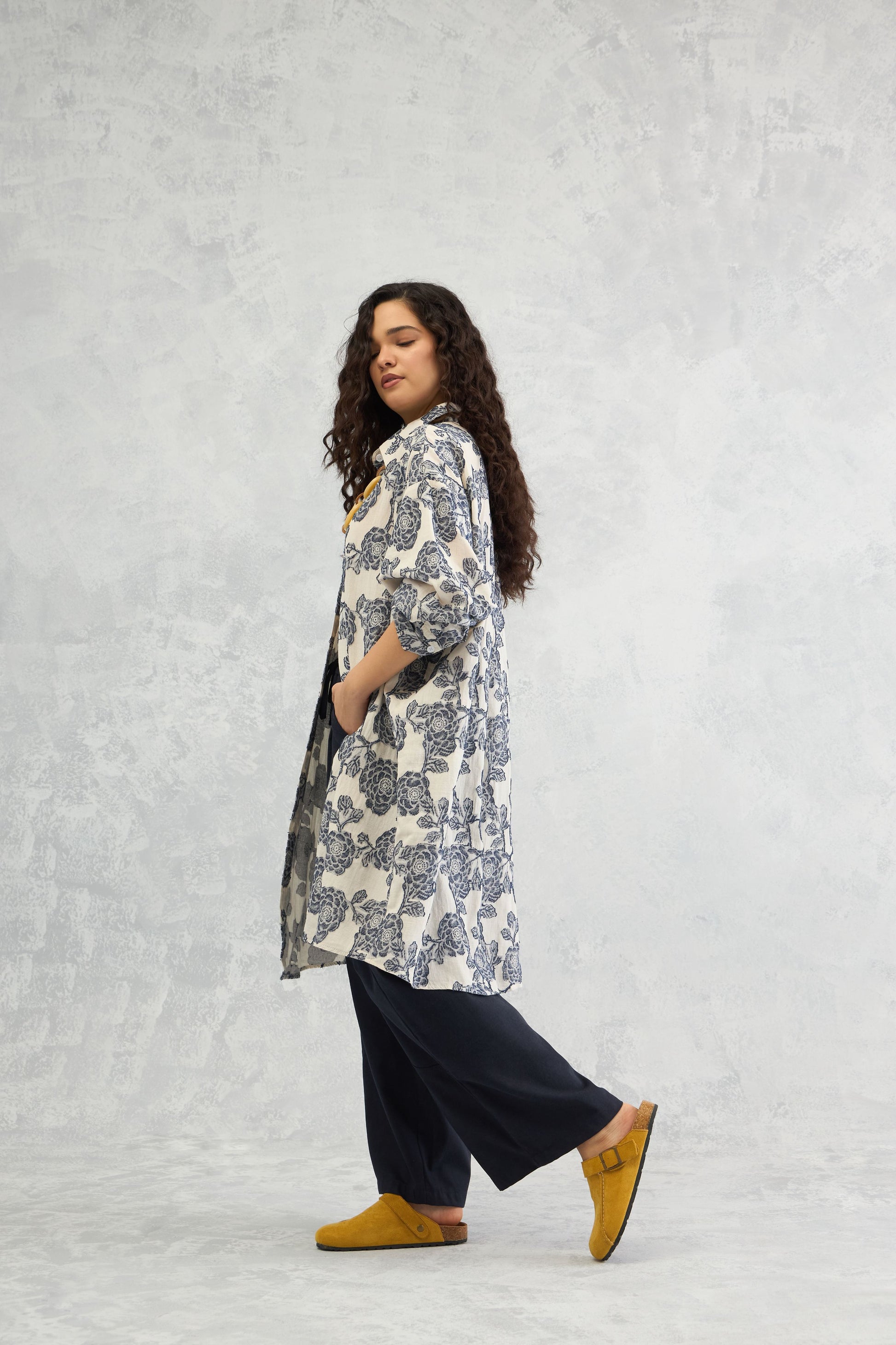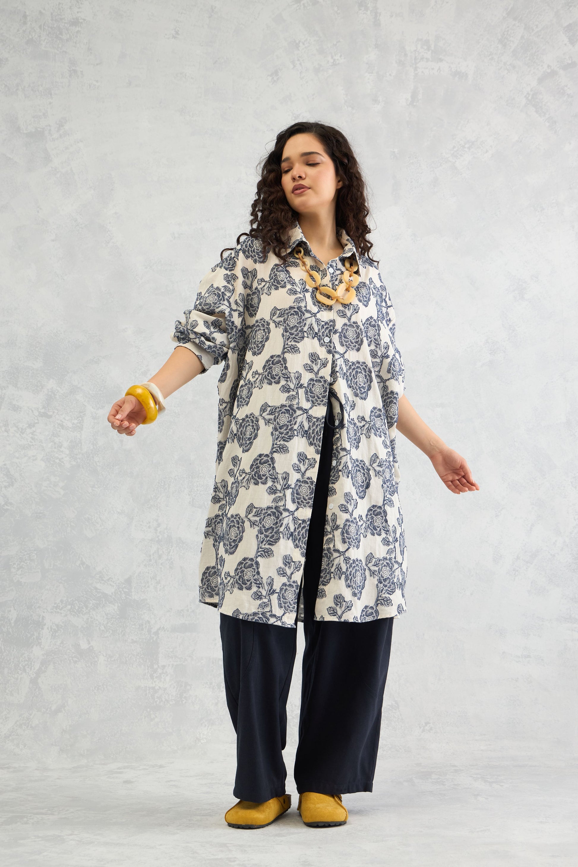 A long oversized cotton tunic shirt crafted in a floral jacquard pattern, blending soft texture with a statement silhouette for an effortless yet elevated look.