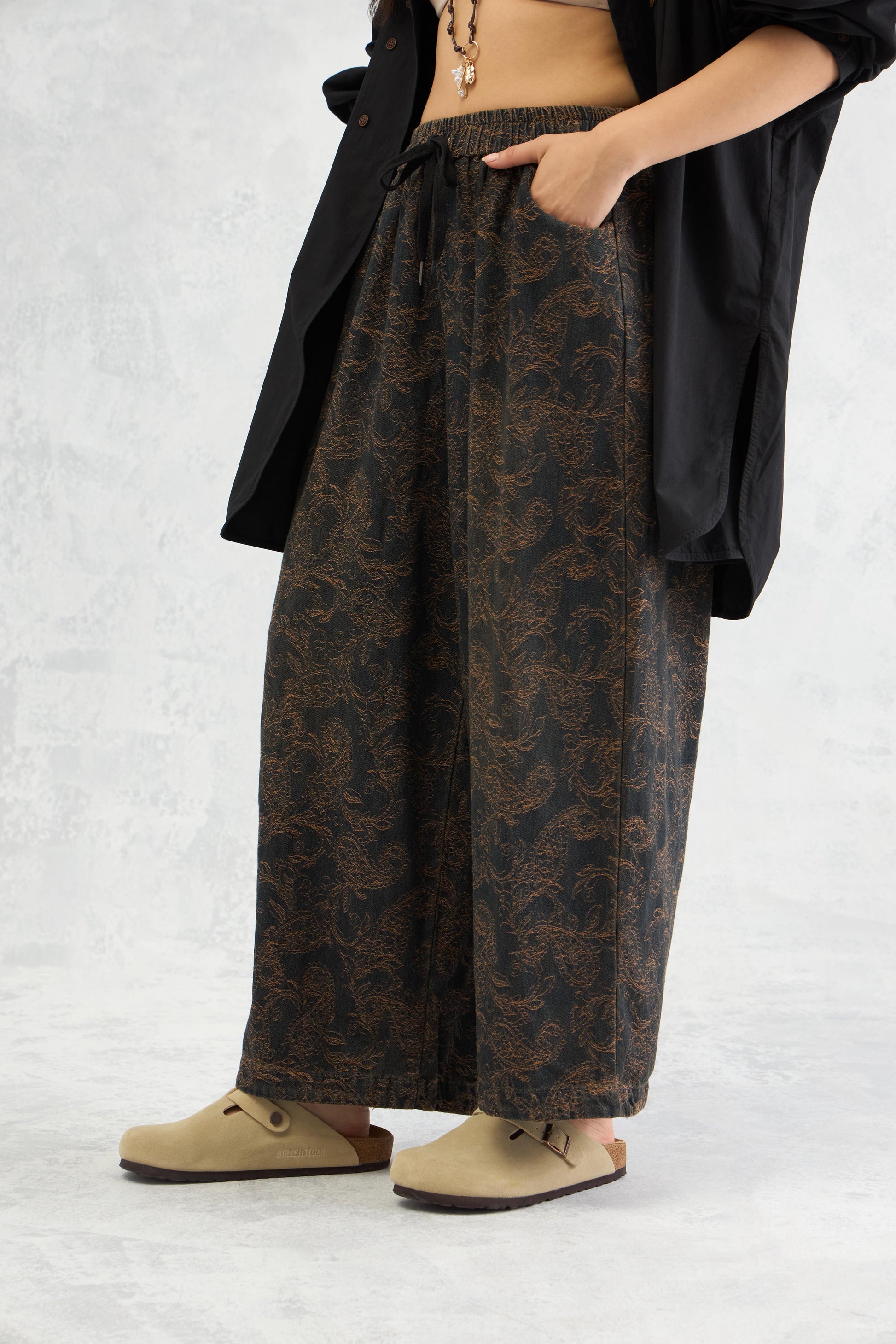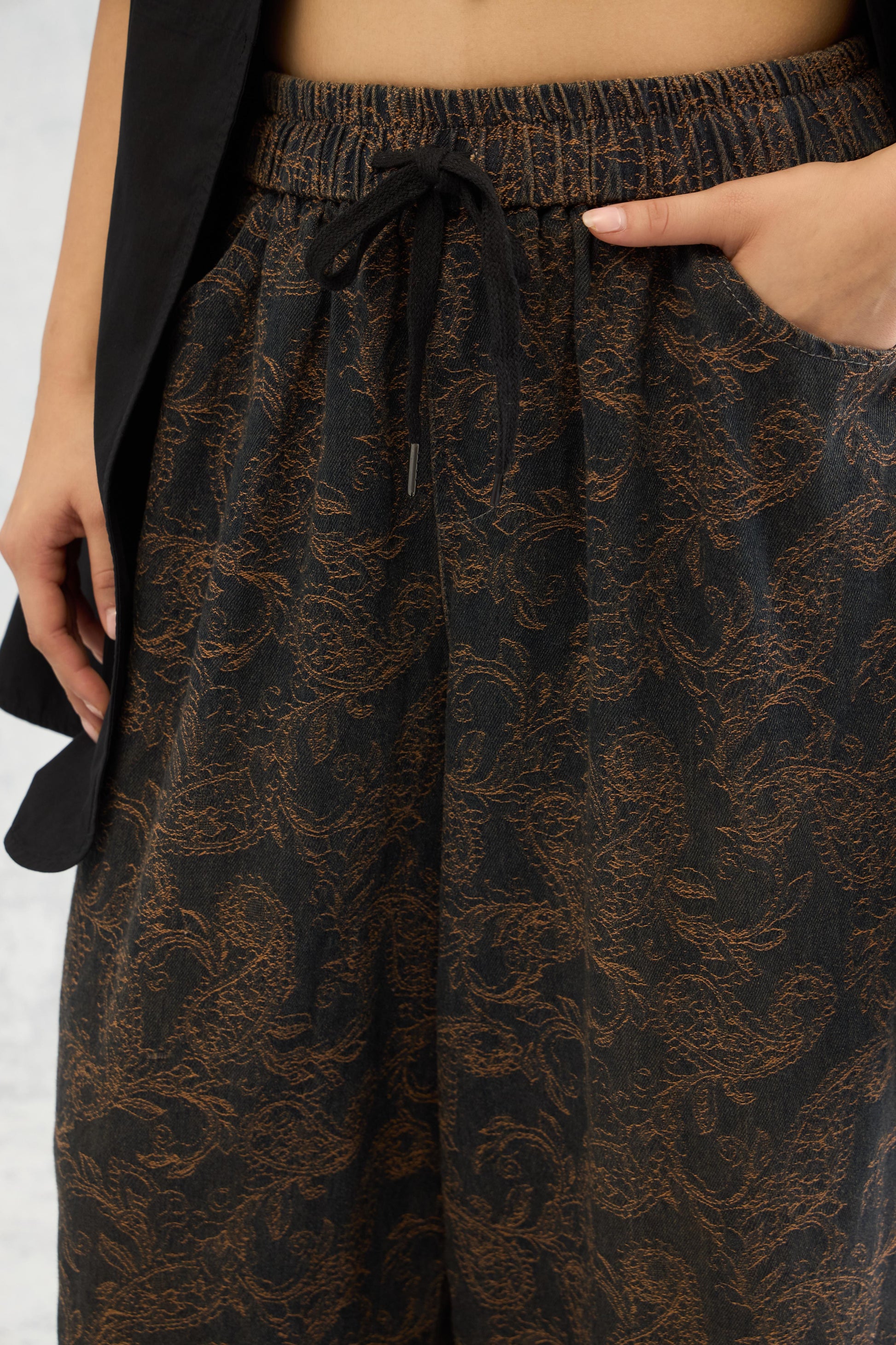 Retro vibes with a modern twist. These vintage jacquard denim barrel pants feature an elasticated waist for comfort and plain denim patch pockets at the back for a playful, effortless edge