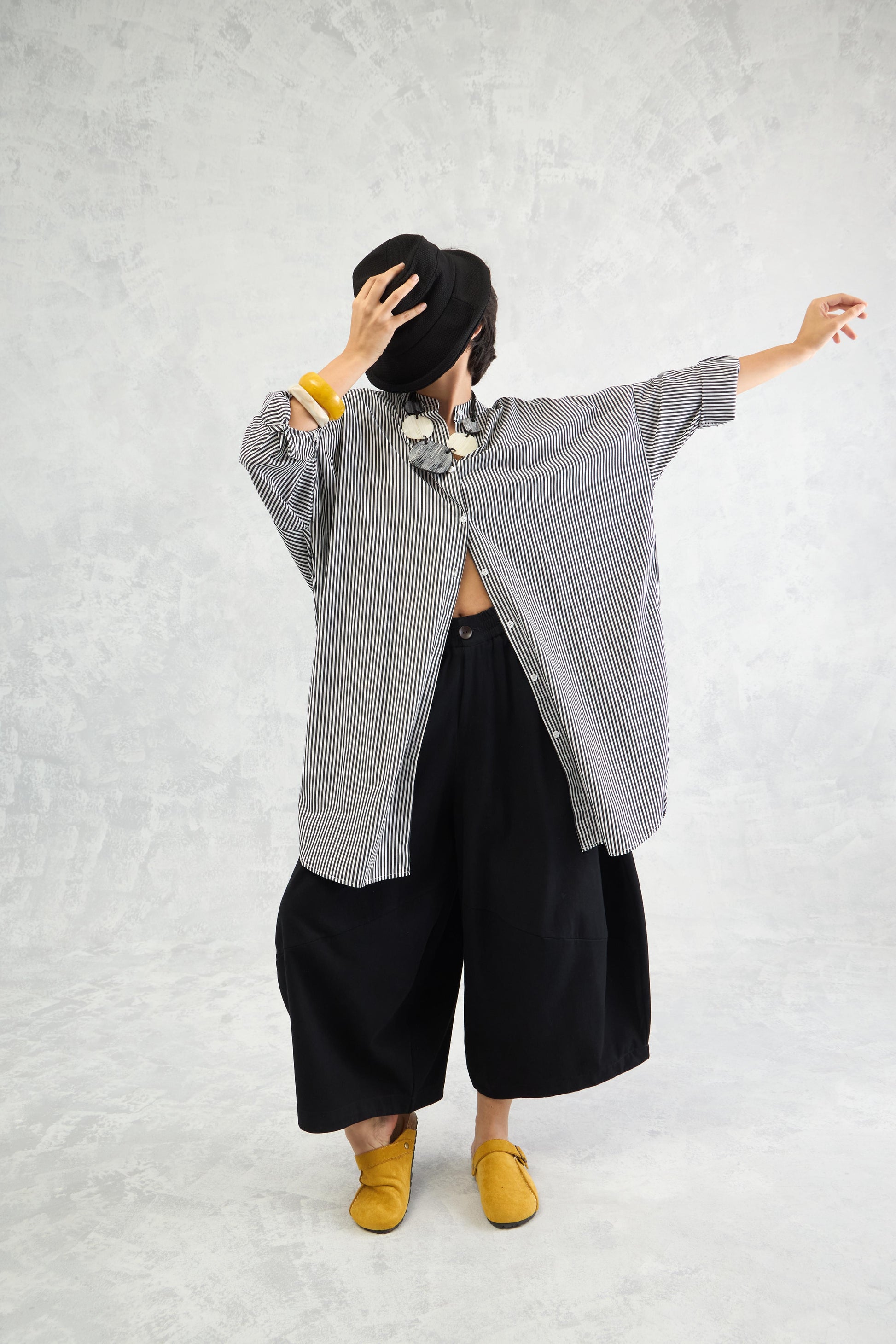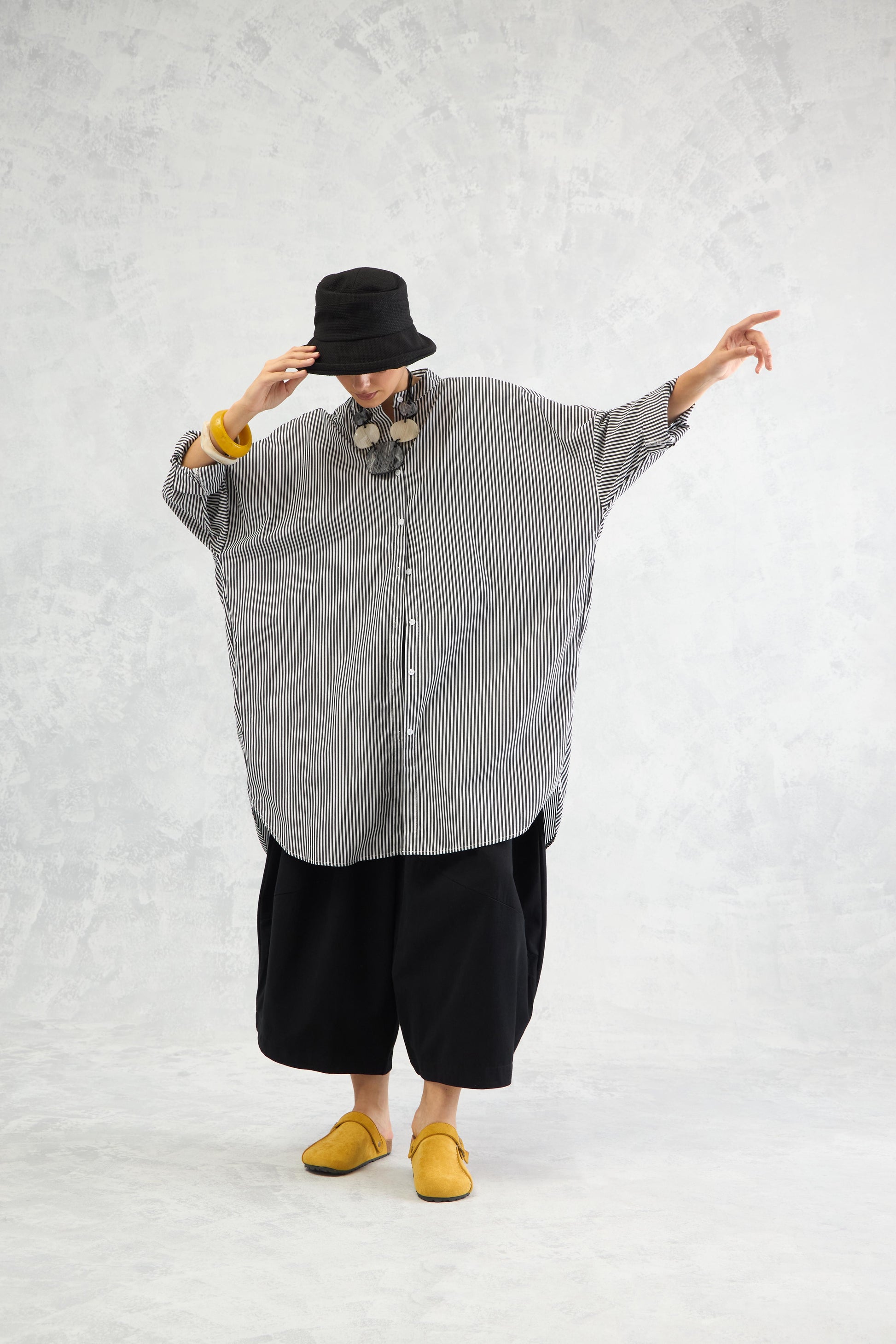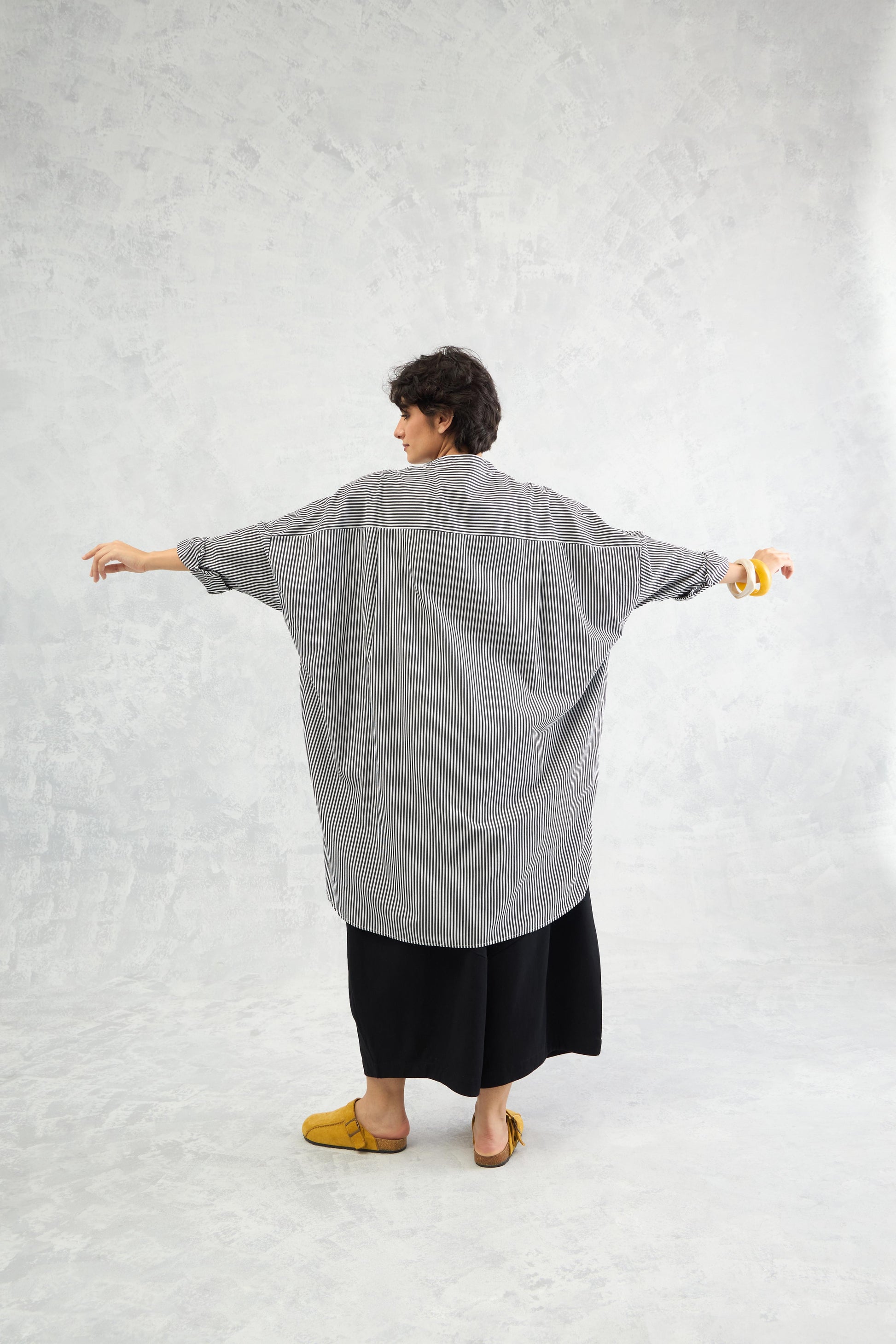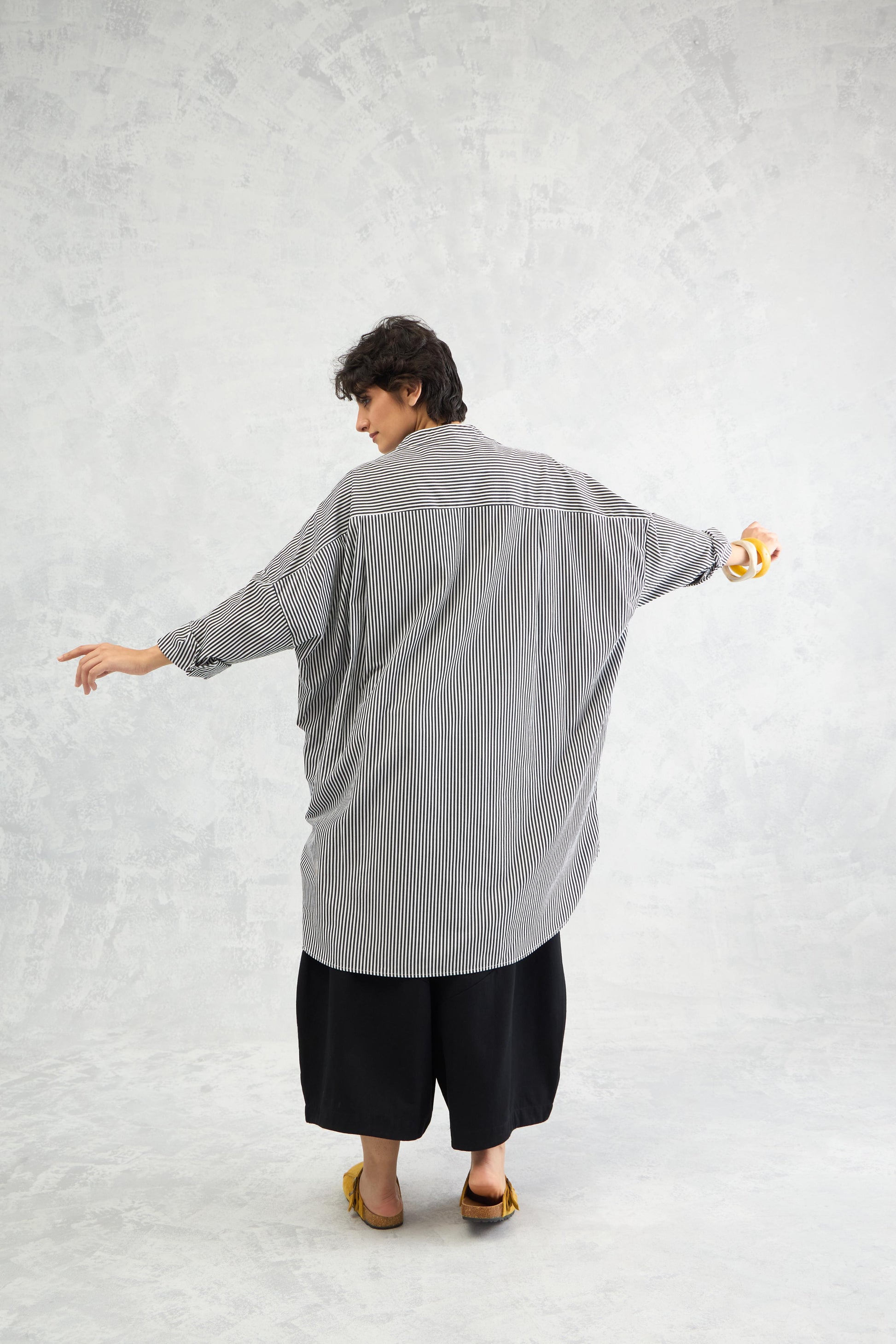 An oversized pinstriped shirt in soft peached poplin, designed with batwing sleeves that add volume and movement for a relaxed yet statement look.