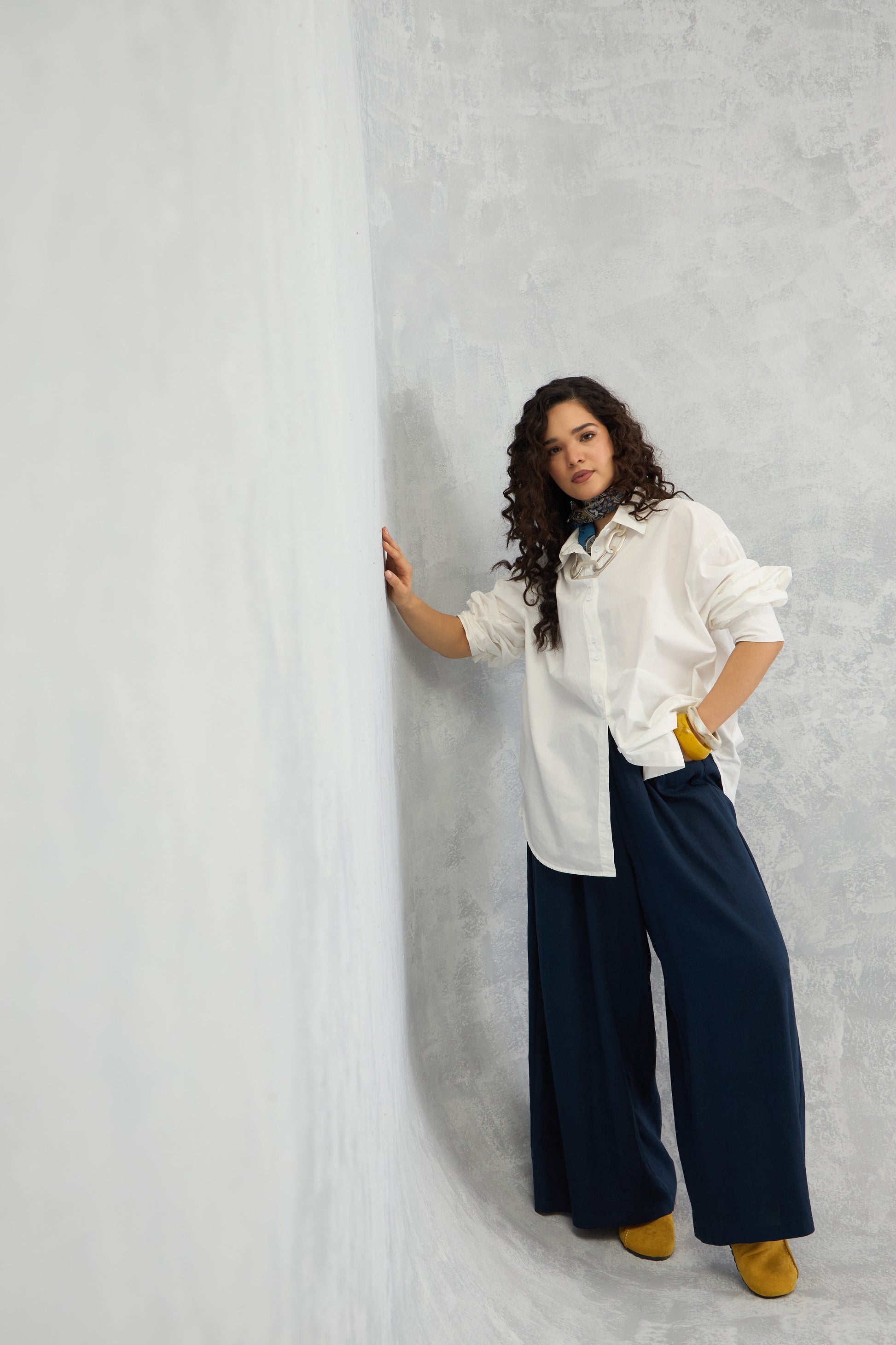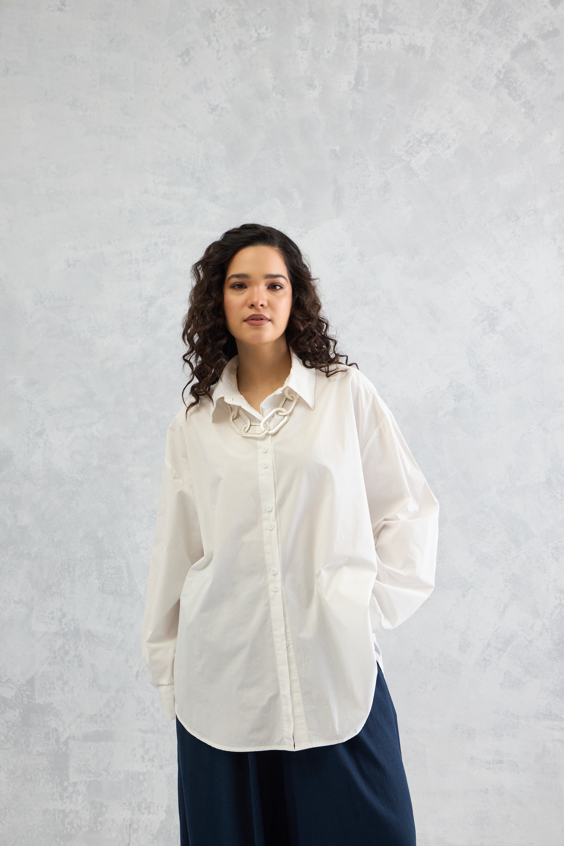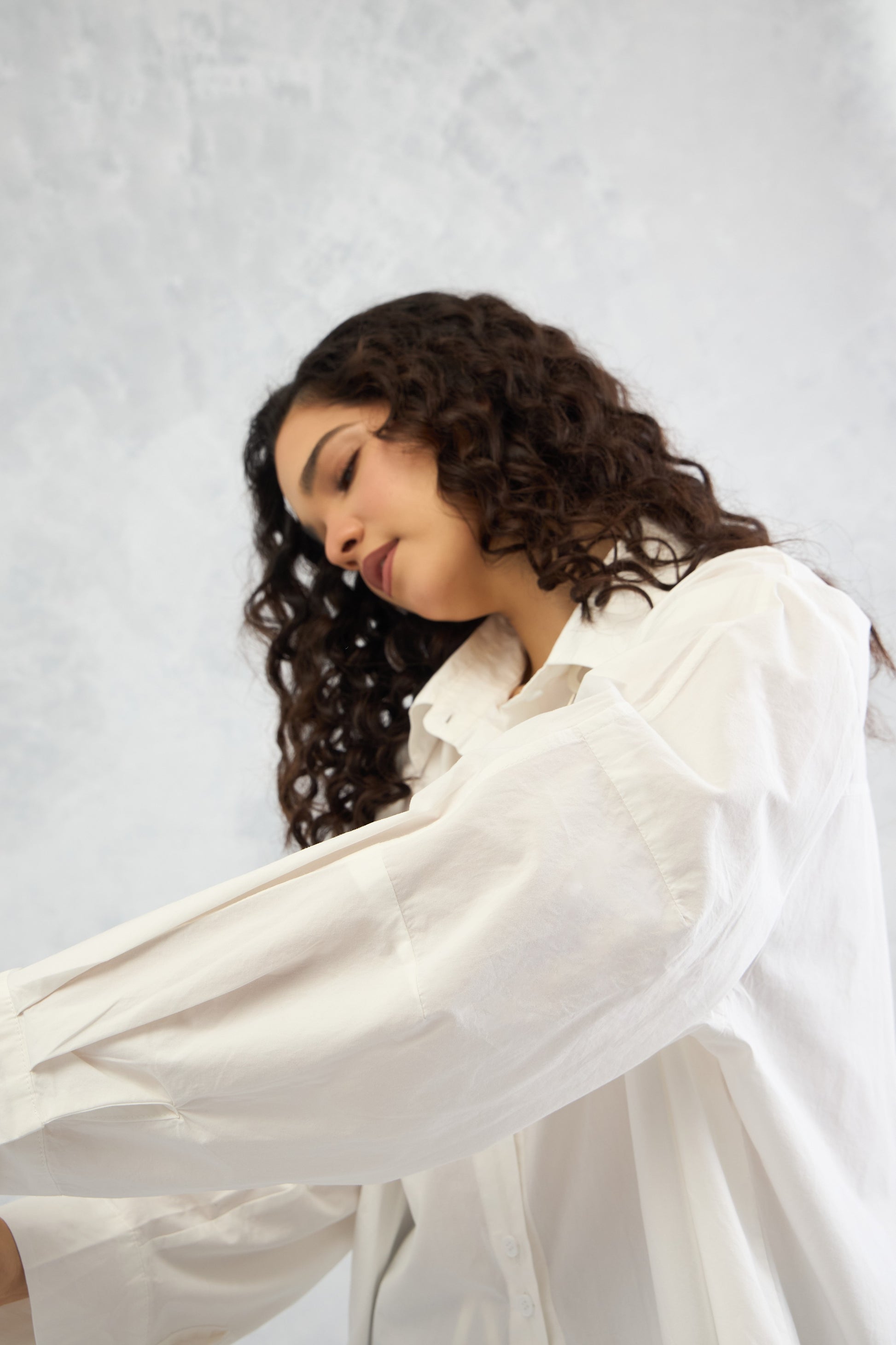 A crisp oversized raglan-sleeve shirt with a shifted side seam, unique hemline detailing, and a center back seam panel that adds subtle volume for a modern, structured look.