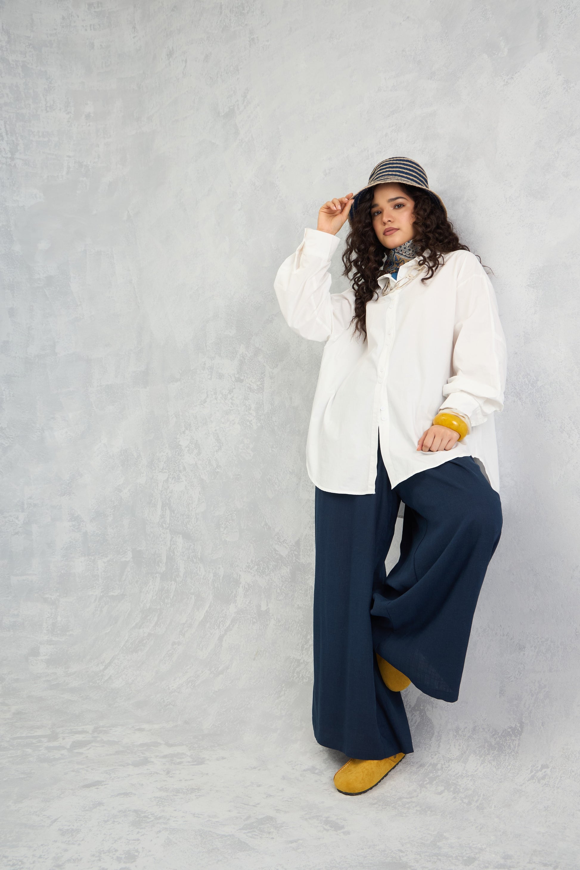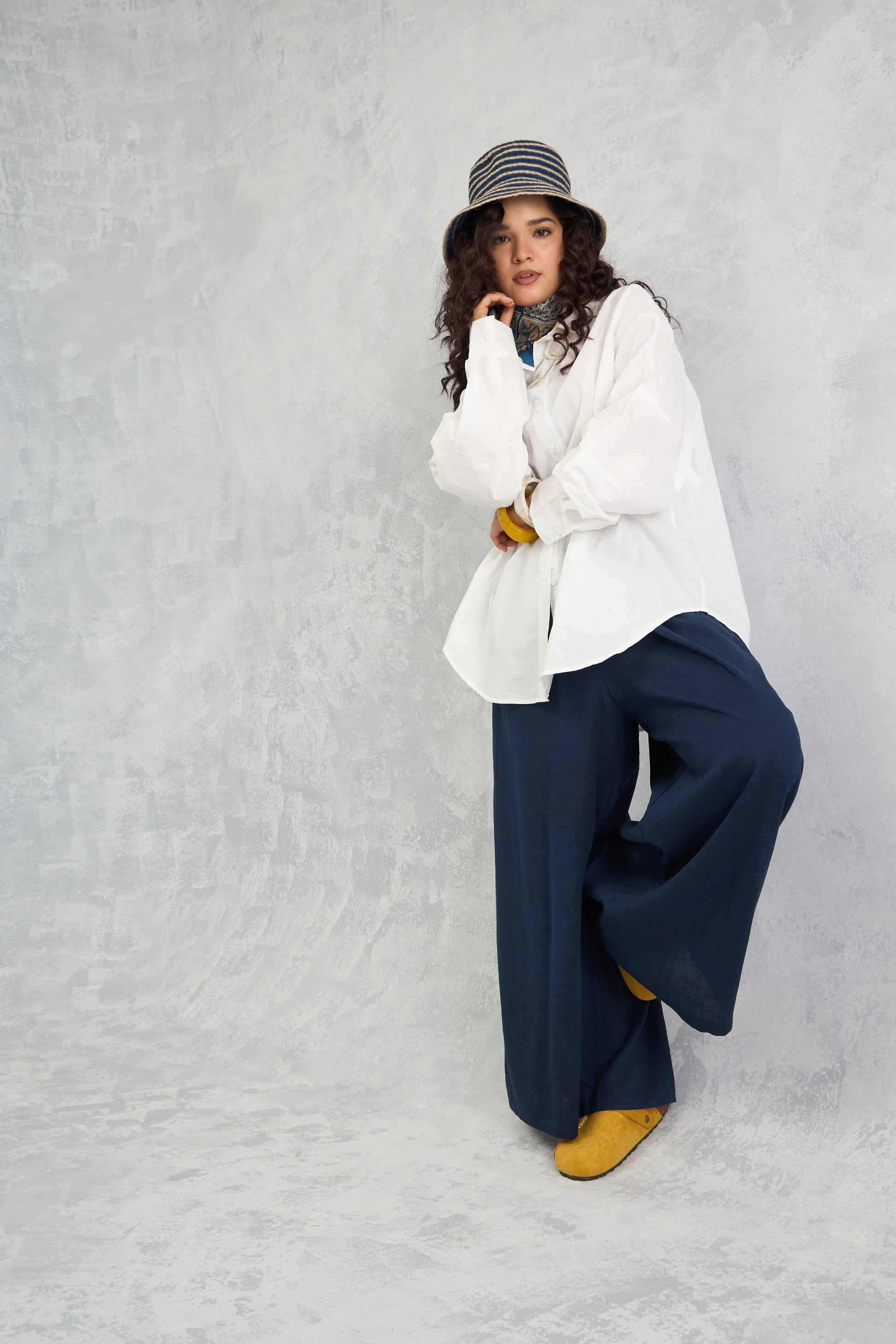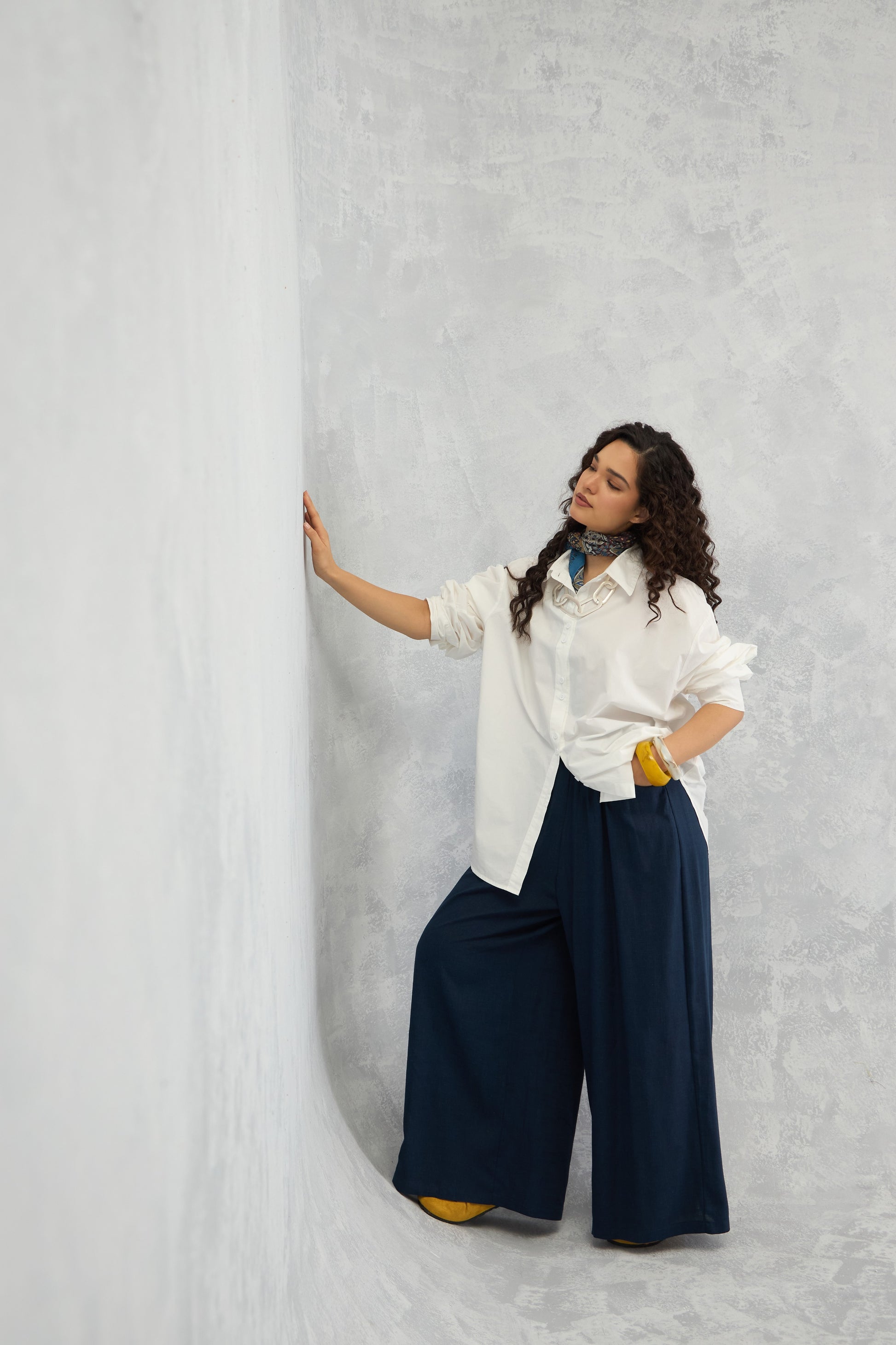 A crisp oversized raglan-sleeve shirt with a shifted side seam, unique hemline detailing, and a center back seam panel that adds subtle volume for a modern, structured look.