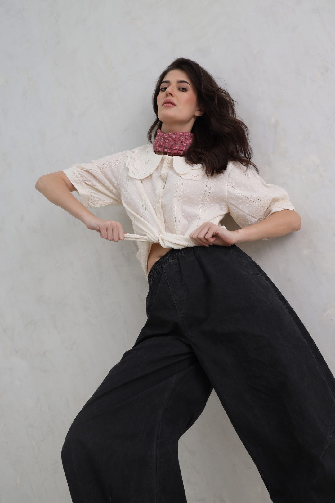 This front-open cotton schiffli top exudes charm with its delicate texture and adorable Peter Pan collar. Lightweight and breathable, it’s the perfect choice for a relaxed day out or a stylish brunch. Feminine and fresh, it pairs beautifully with both casual and dressy bottoms for effortless elegance.