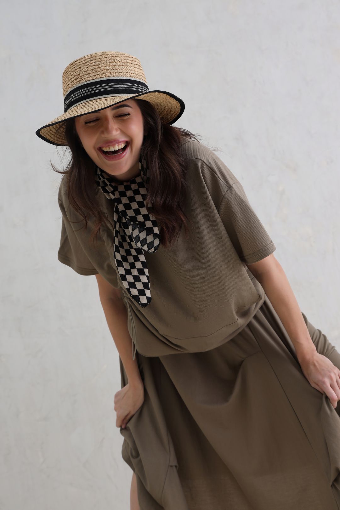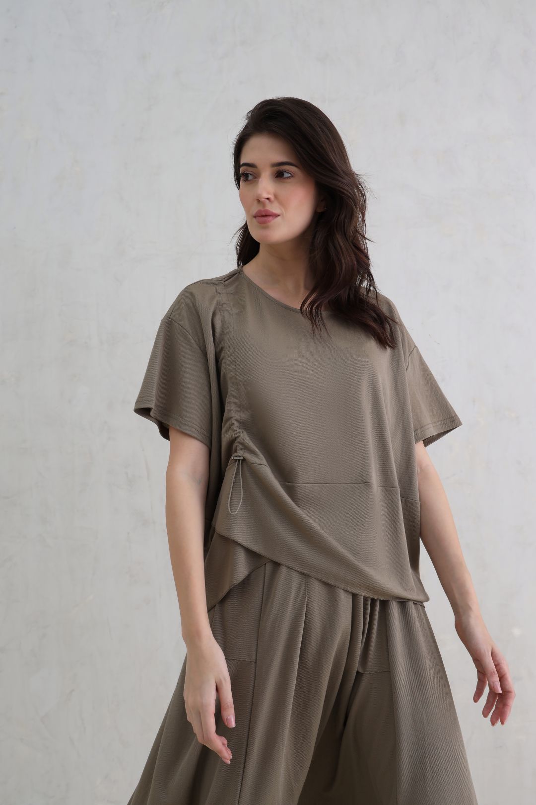This knitted top features a stylized hemline and an elasticated drawstring detail along the princess seam, allowing for a customizable scrunched effect. Comfortable yet fashion-forward, it adds subtle structure and texture to a simple silhouette.
