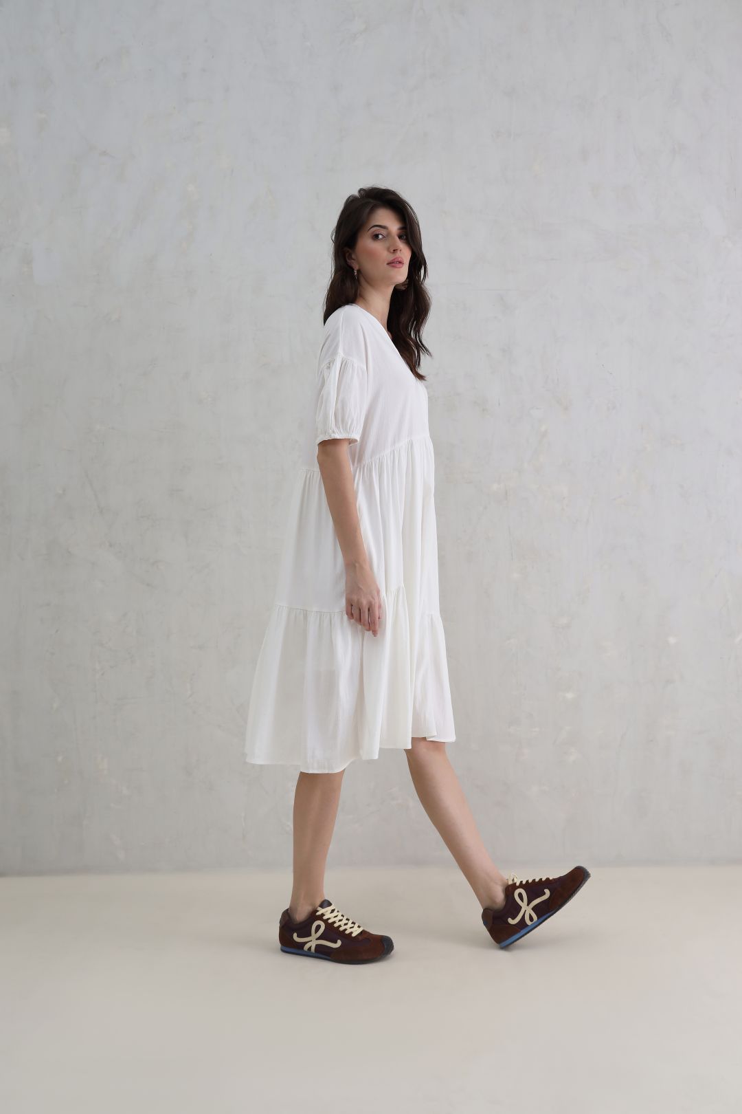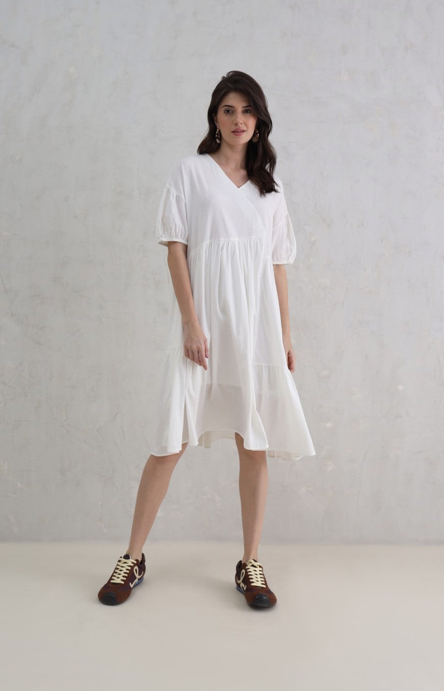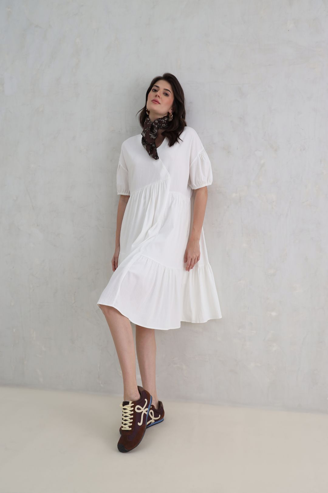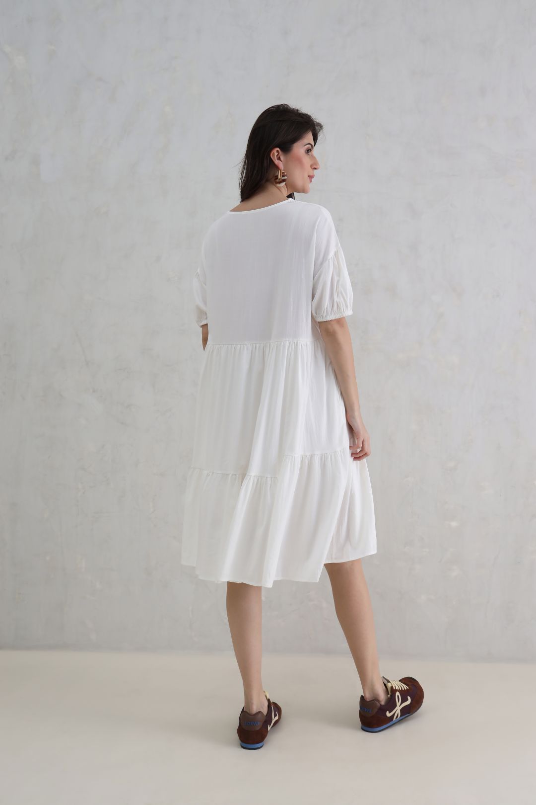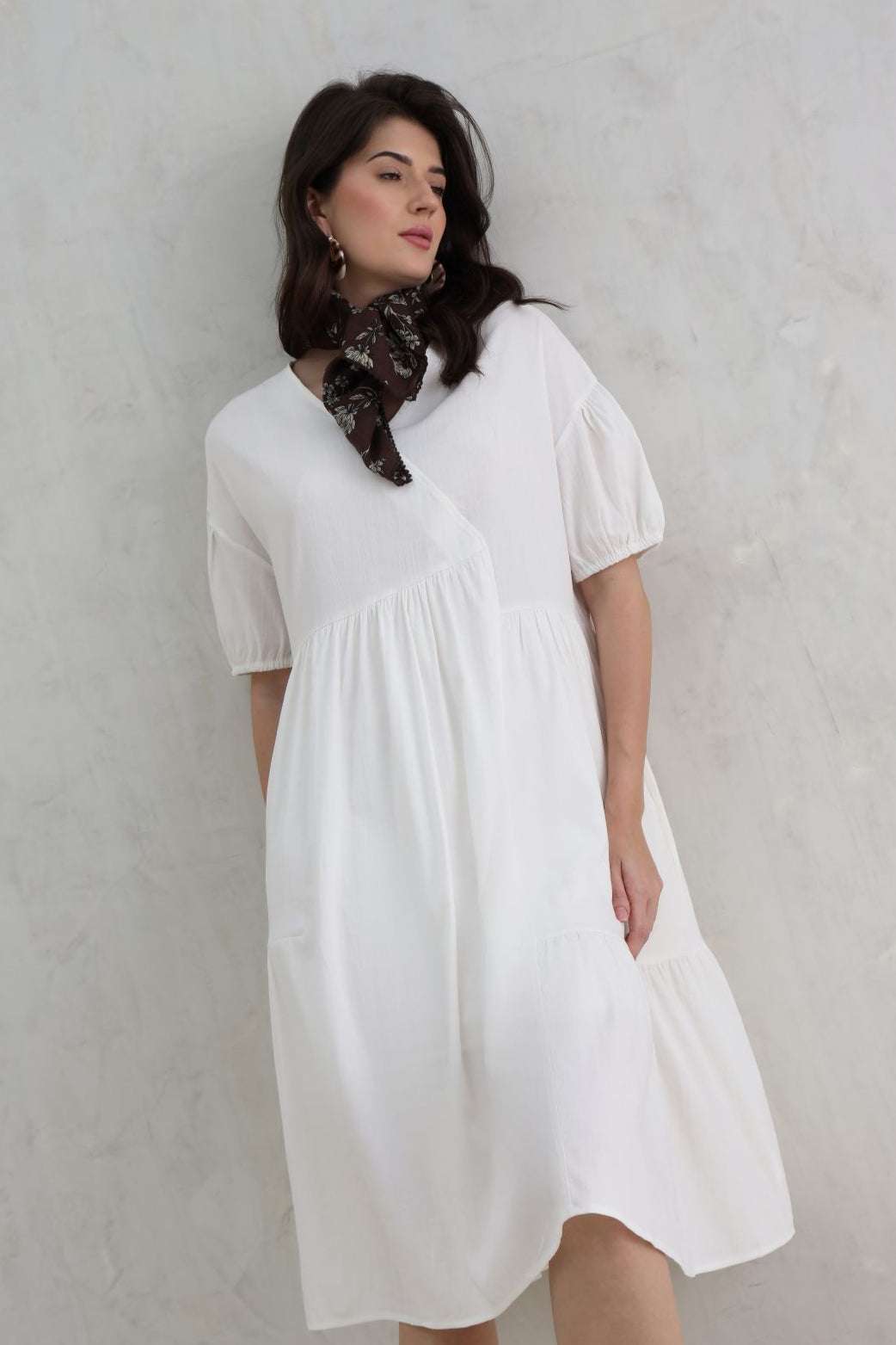 This white easy dress features a crossover empire yoke that flatters the silhouette, flowing into a tiered skirt that adds volume and graceful movement. Designed for comfort and femininity, it exudes effortless elegance—perfect for warm days when you want to feel light, stylish, and beautifully put together.