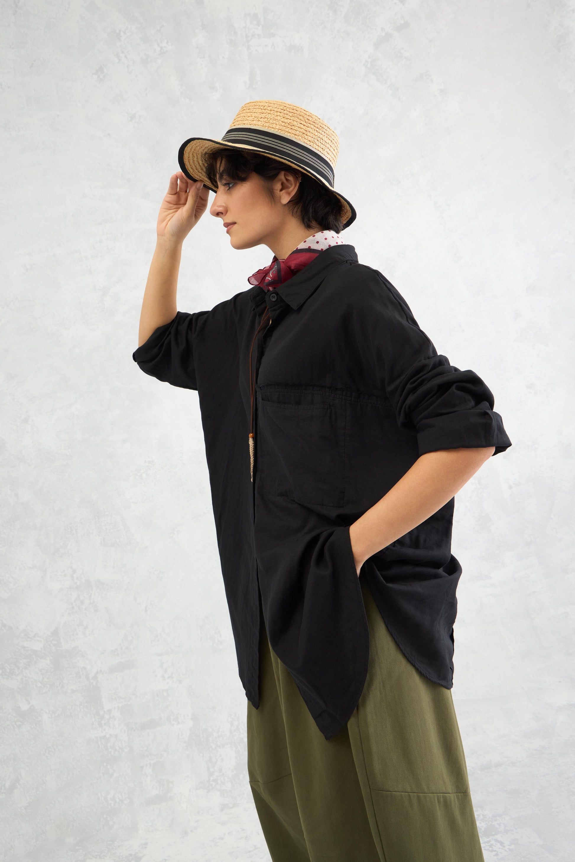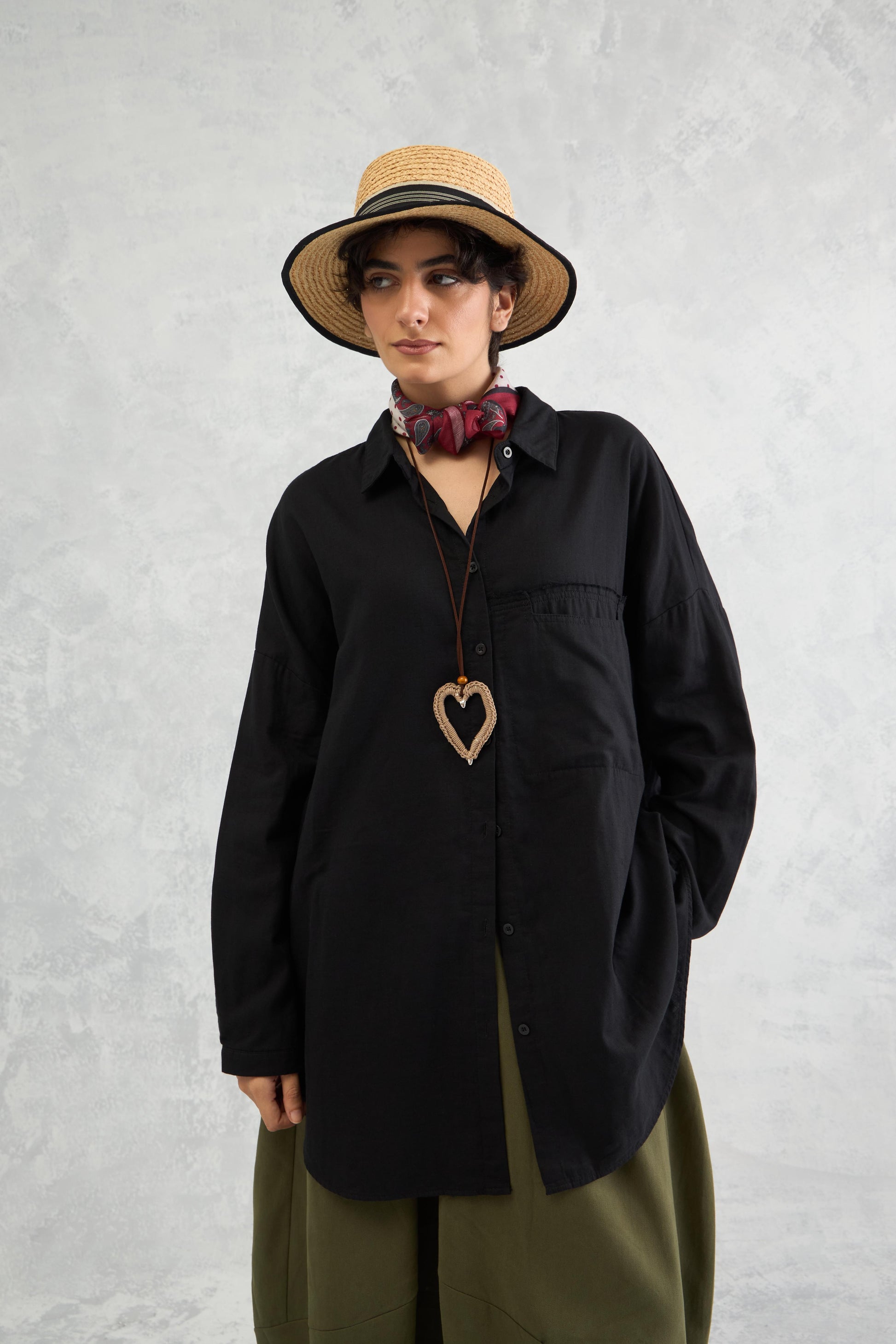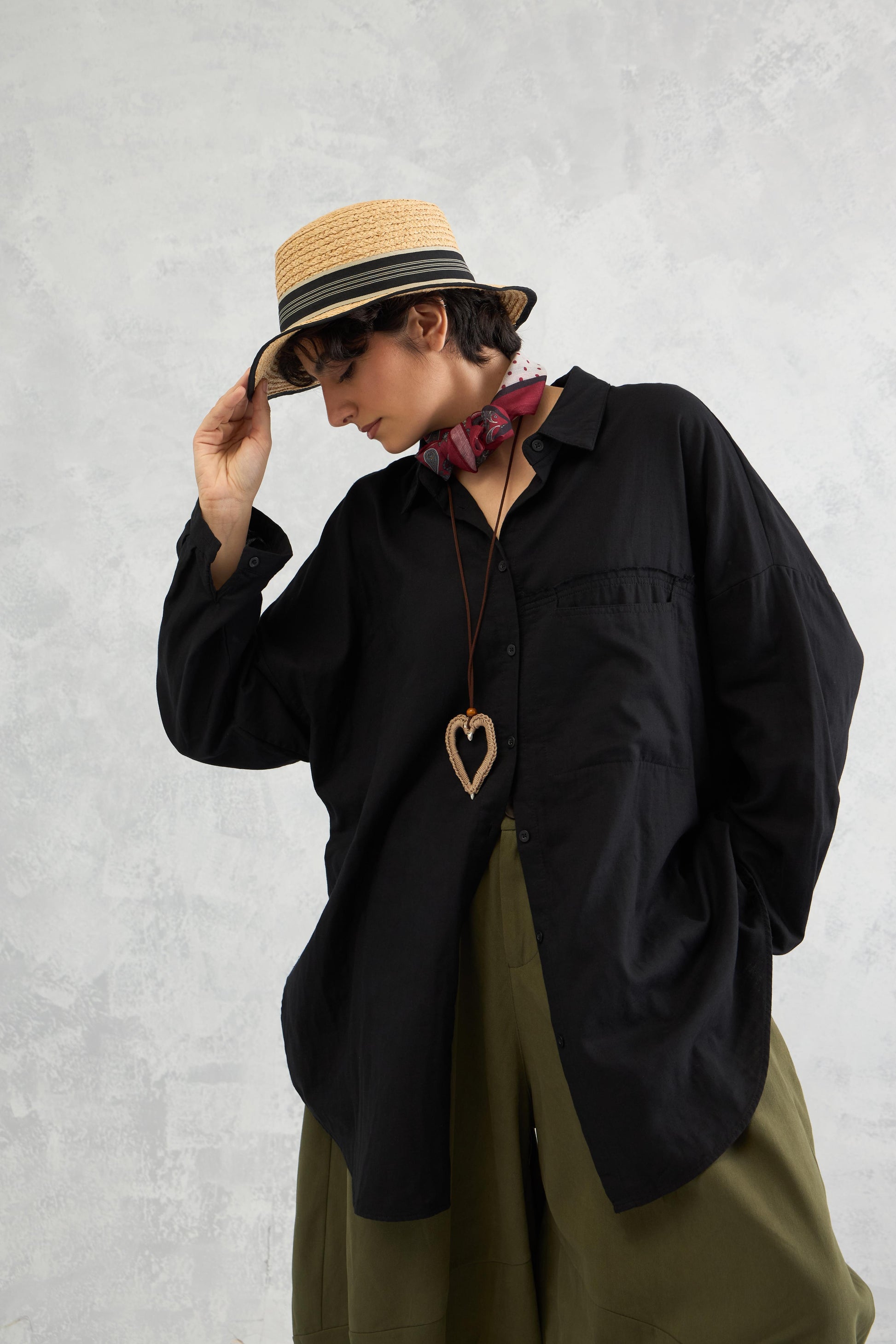 A relaxed drop-shoulder shirt in double cloth with frayed edge detailing, a curved hemline, and panelled construction for an easy yet edgy look.