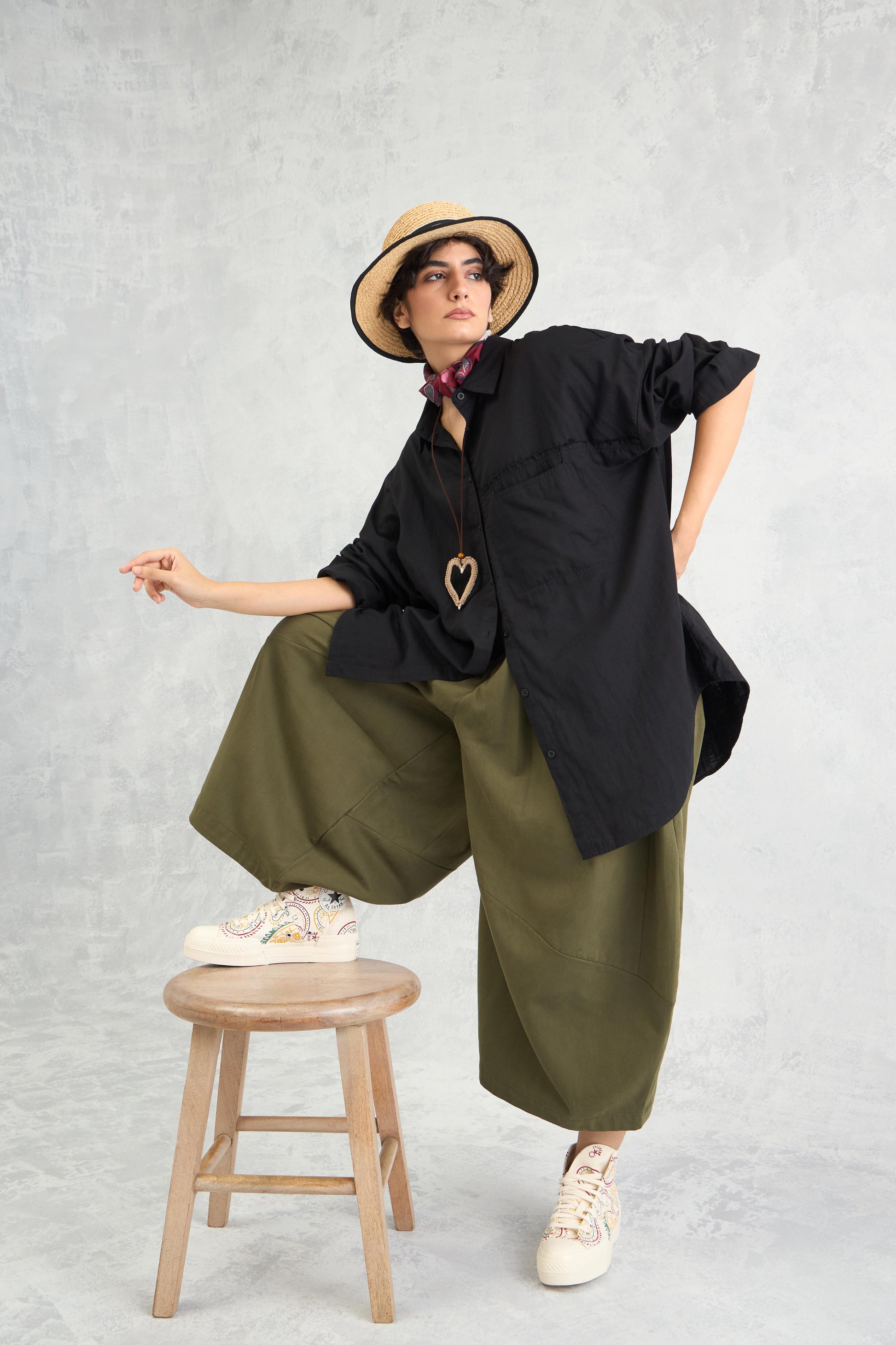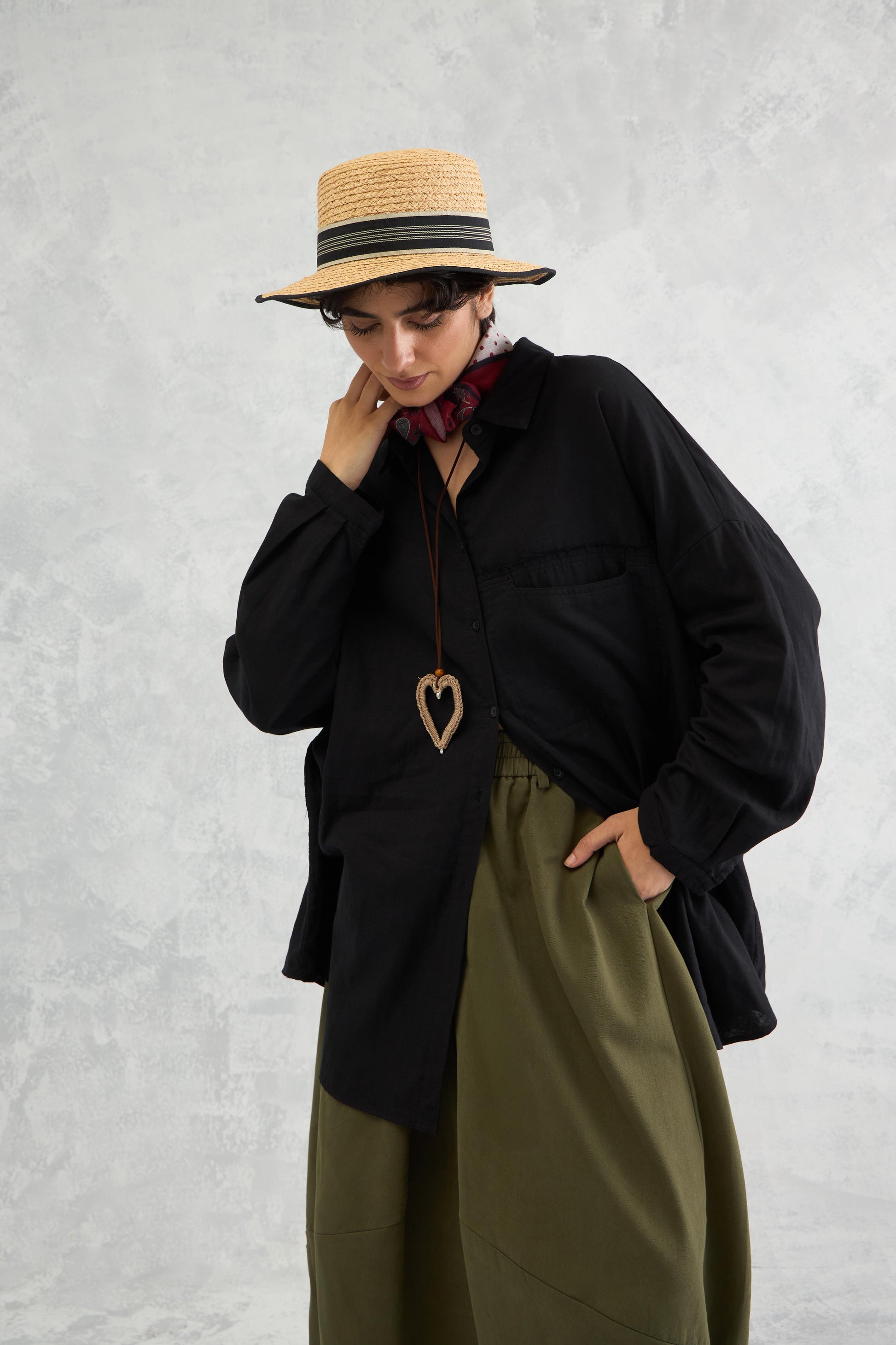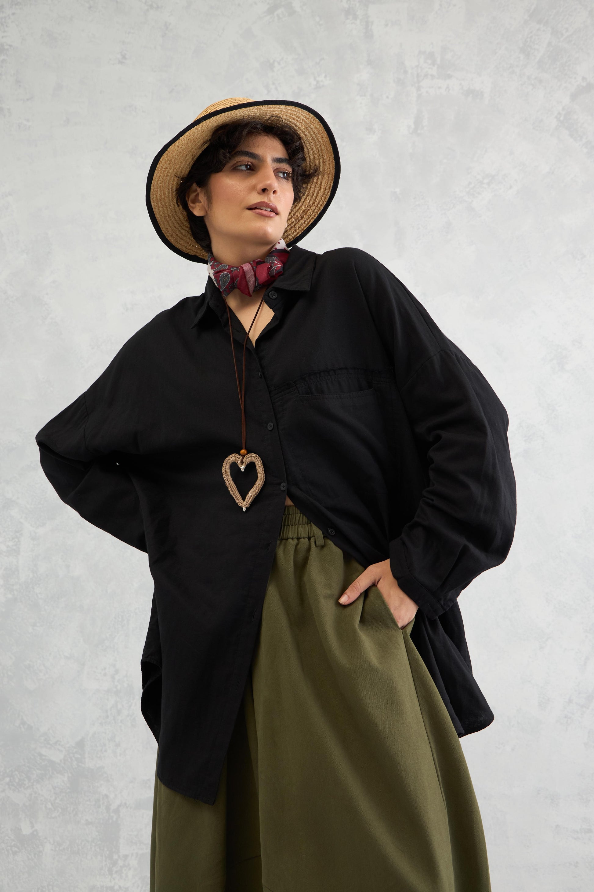 A relaxed drop-shoulder shirt in double cloth with frayed edge detailing, a curved hemline, and panelled construction for an easy yet edgy look.