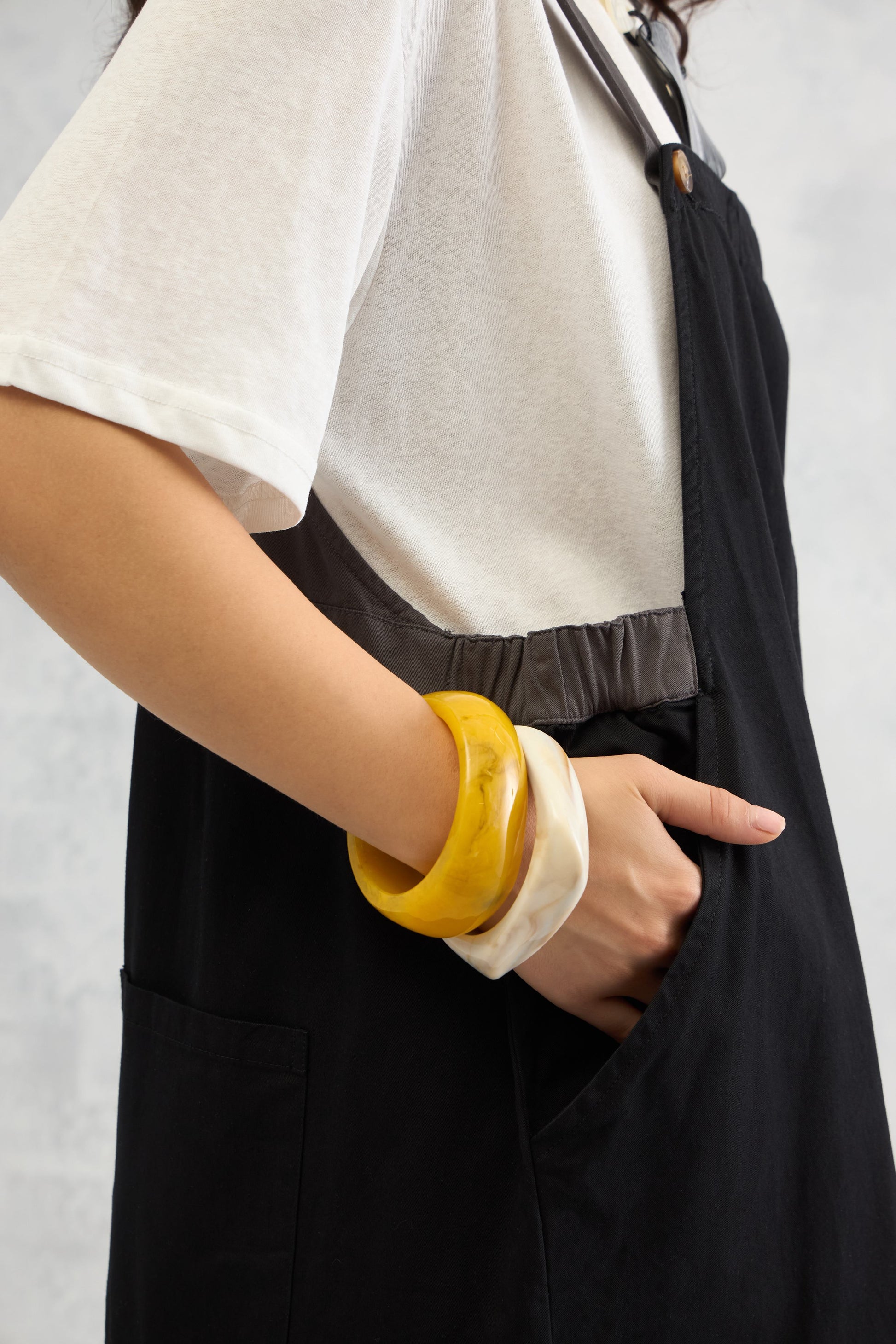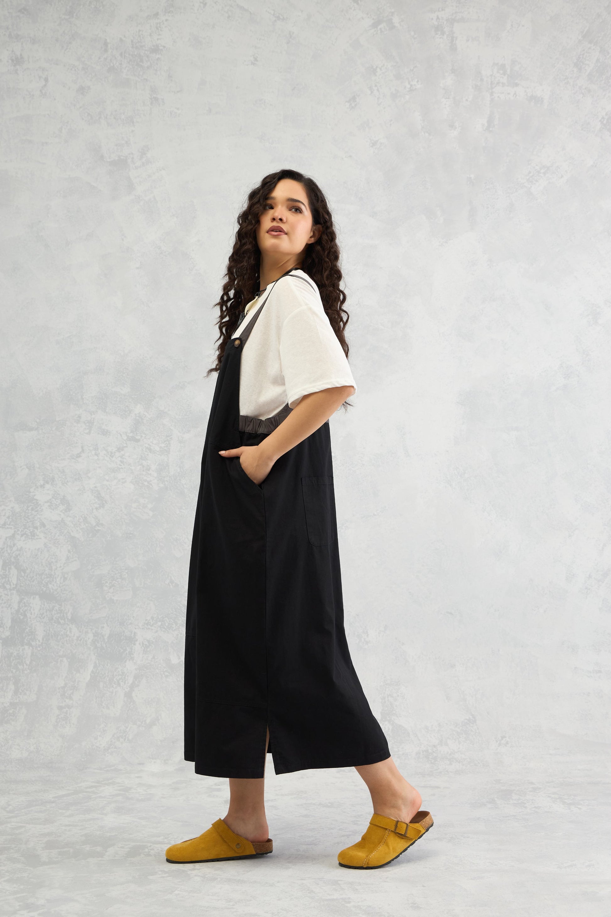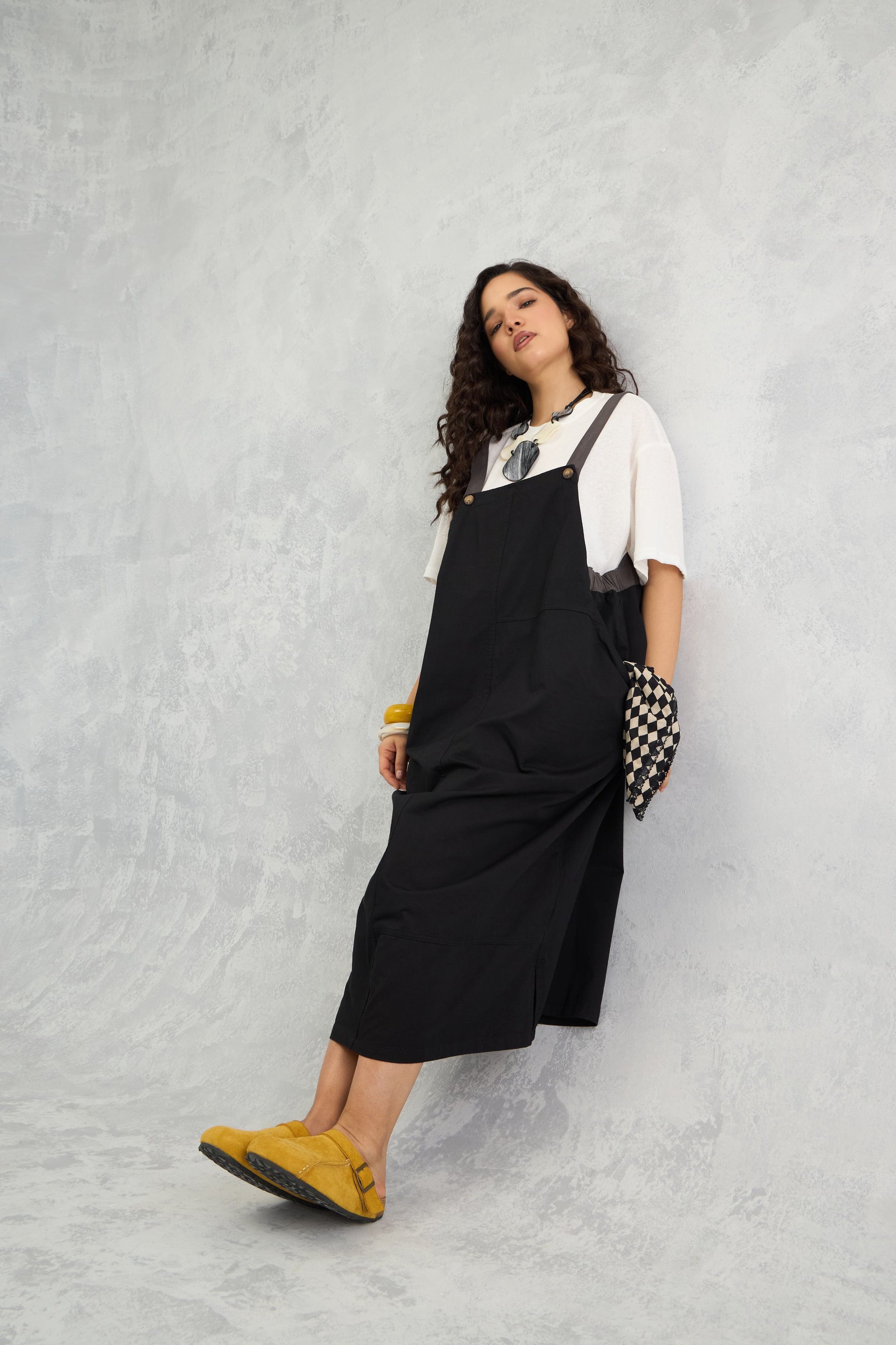 An oversized dungaree dress with a relaxed silhouette, elevated by contrast strap detailing for a bold edge. Finished with utility pockets, it’s a modern layering essential with Woong’s global vibe.