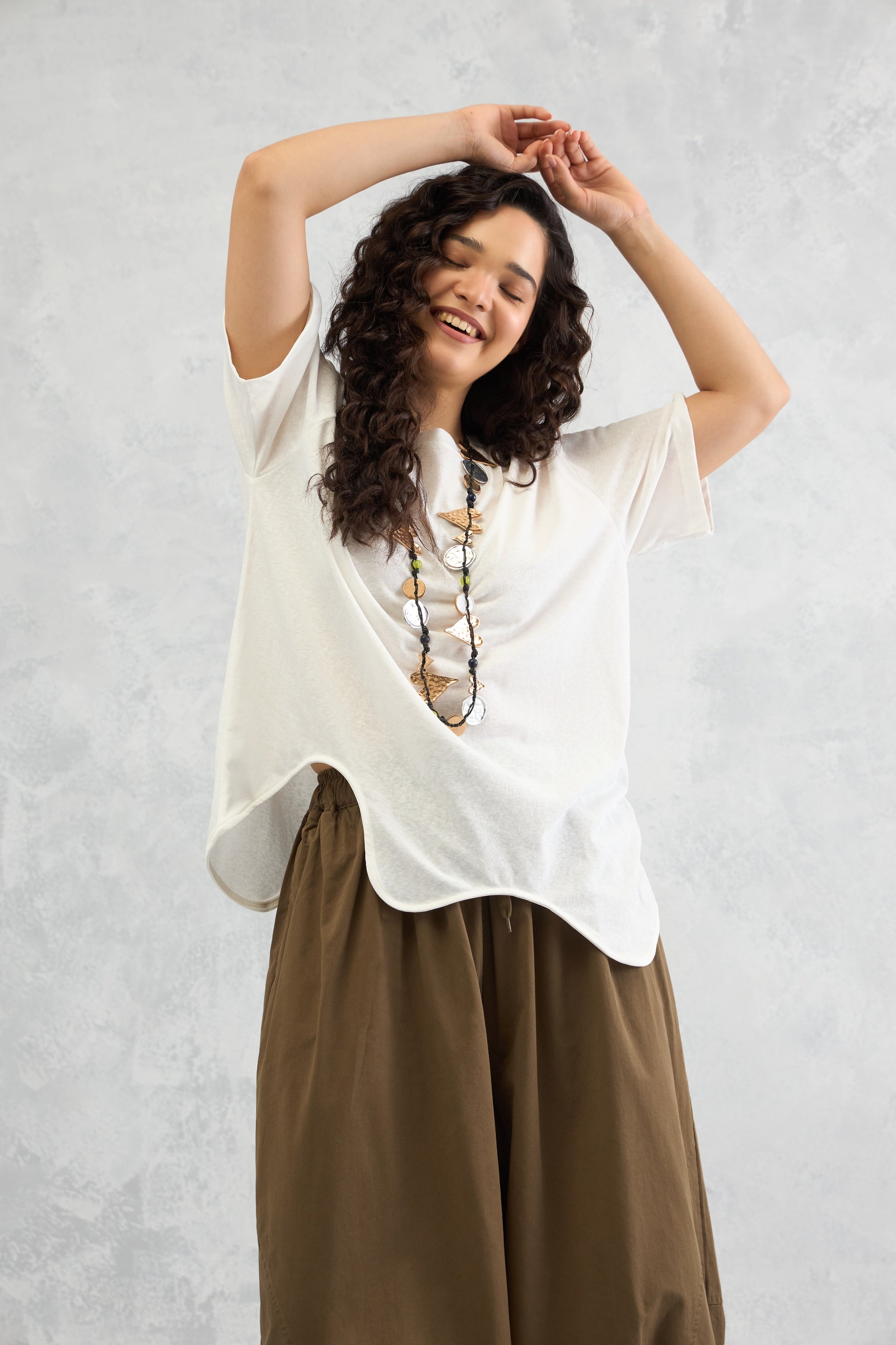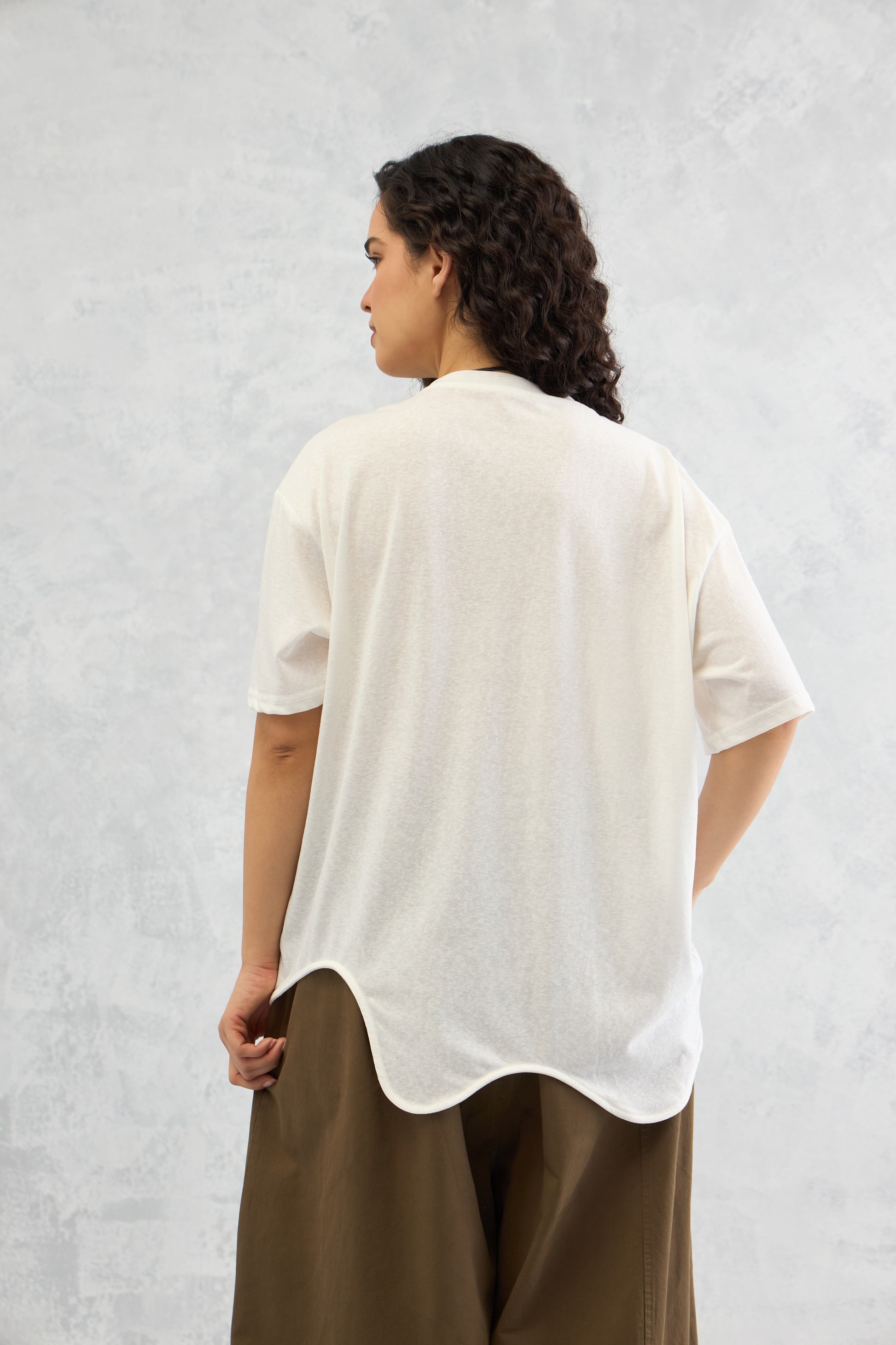A timeless classic with a playful edge. This T-shirt features a wave-shaped hem for a subtle, stylish twist on everyday essentials.