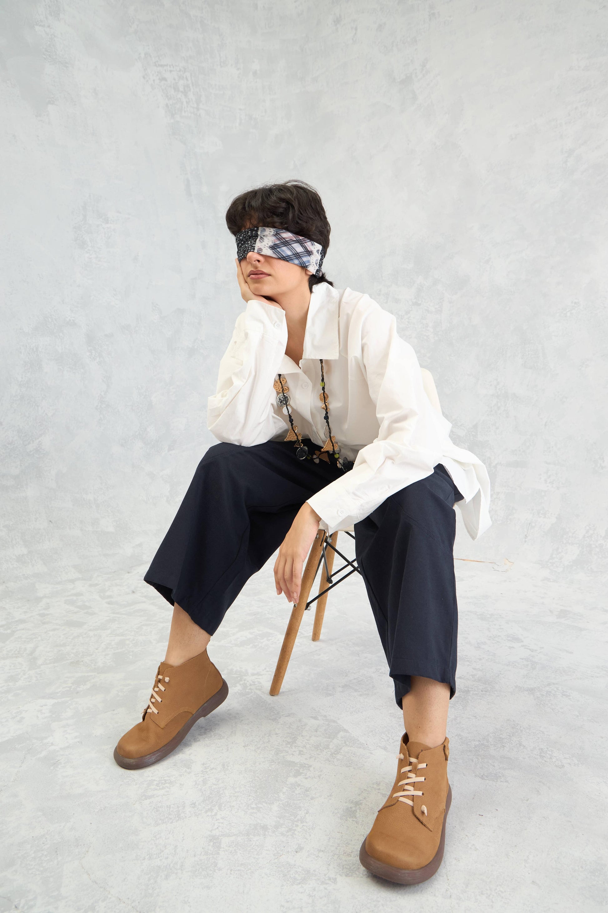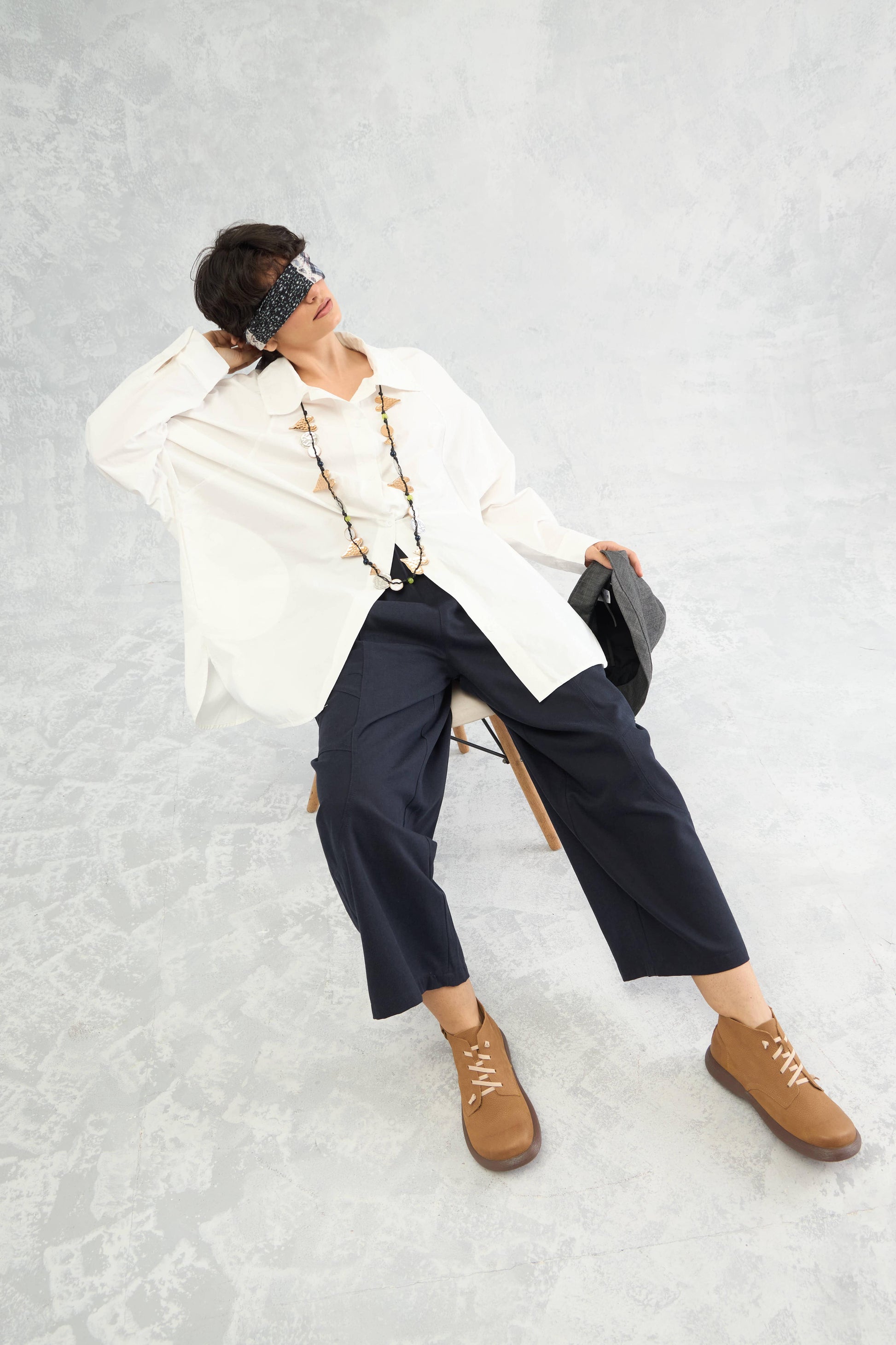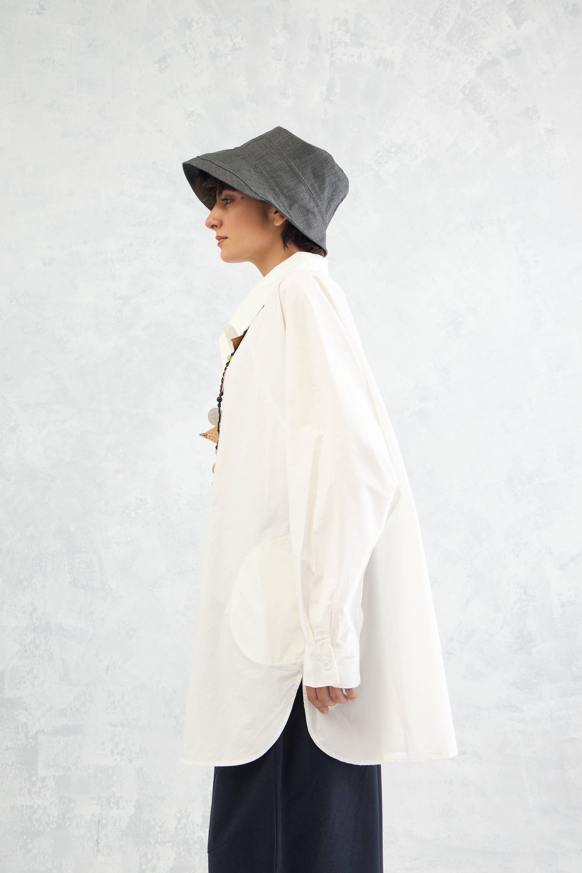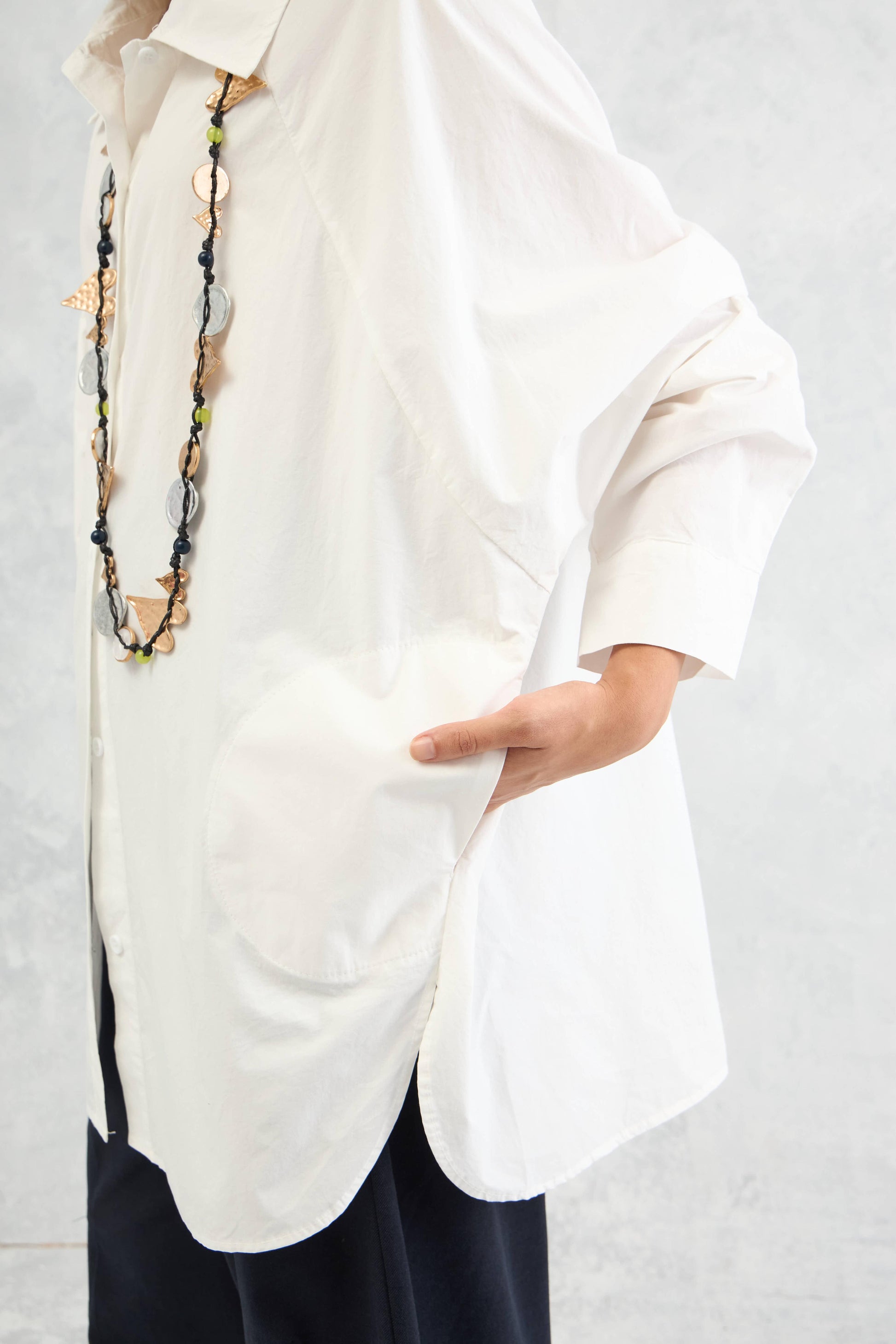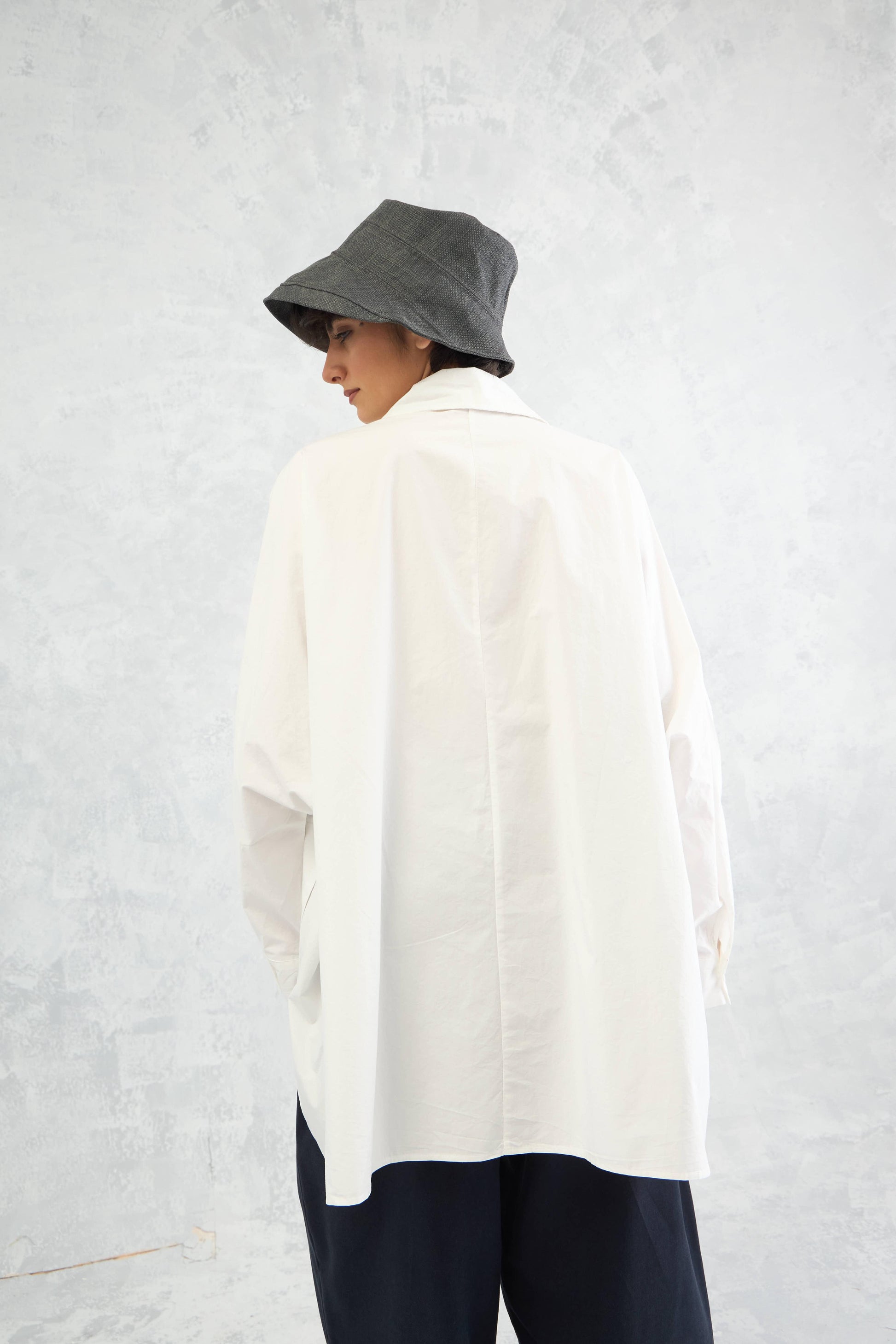 This stylised shirt features a relaxed drop shoulder silhouette, enhanced by a distinctive double-button placket and thoughtfully designed back details. Crafted for the fashion-forward, it combines comfort with elevated design elements, making it a perfect choice for those seeking a modern twist on a timeless wardrobe staple.